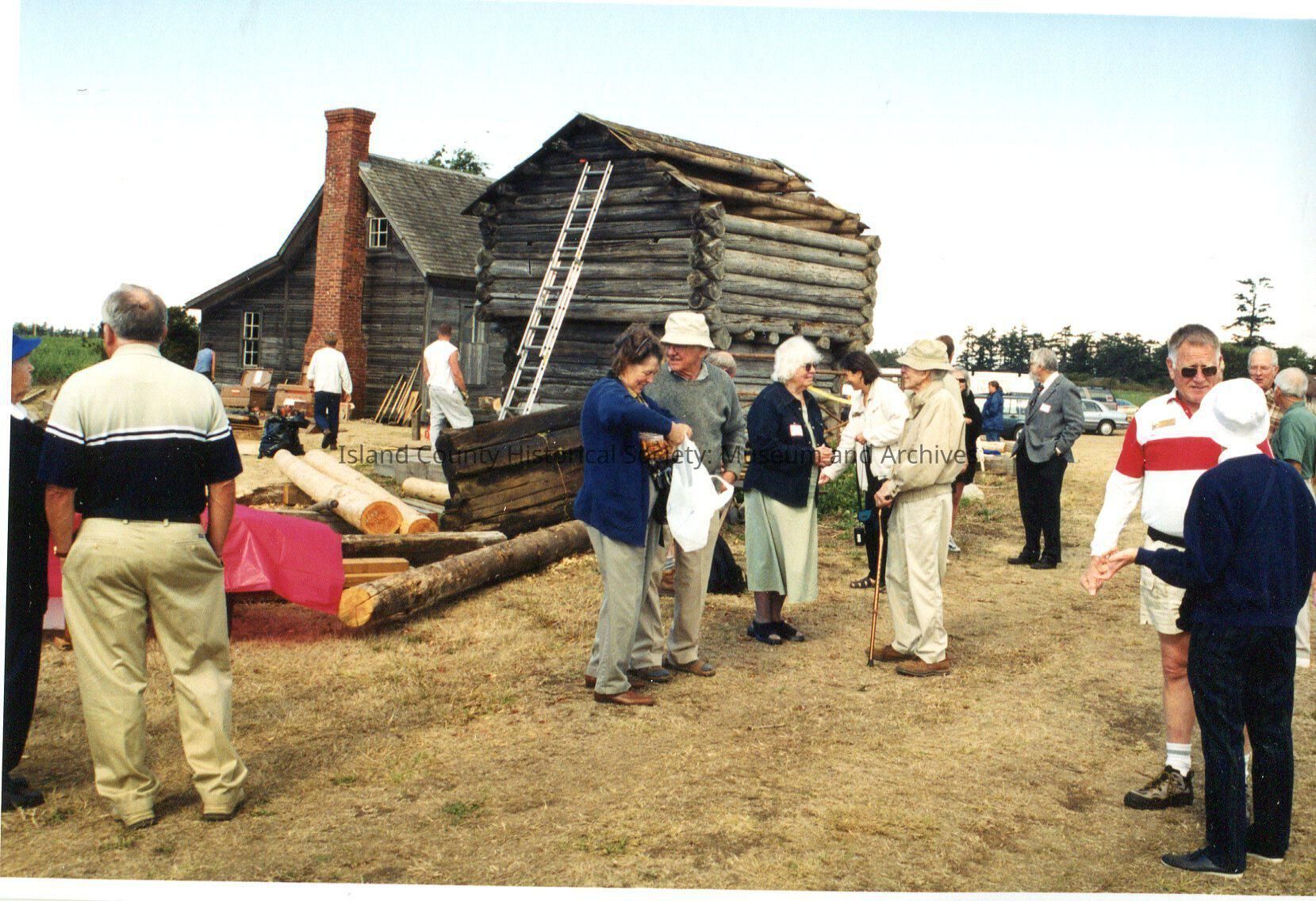 Albert Heath with cane stands talking to a white haired lady. Others mill about in conversation. Logs, vehicles, a ladder, Ebey's house and blockhouse in the background. Ron Van Dyke in red and white shirt on the right.