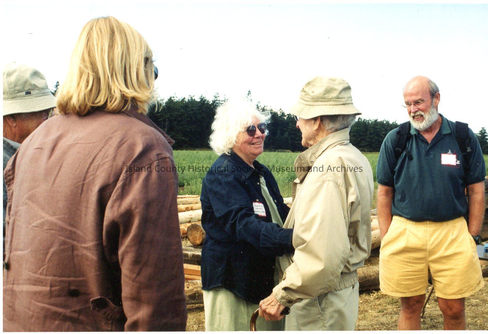 Albert Heath Gathering September 5th 2002 out on Ebey's Prairie. Five people in conversation. Logs on ground with grassland and trees in the background. Woman with white hair has arms around Albert Heath's middle. He looks at her, holding a cane and wearing a fishing hat and tan/ecru coloured jacket. Man with beard and in green shirt with yellow shorts on right
