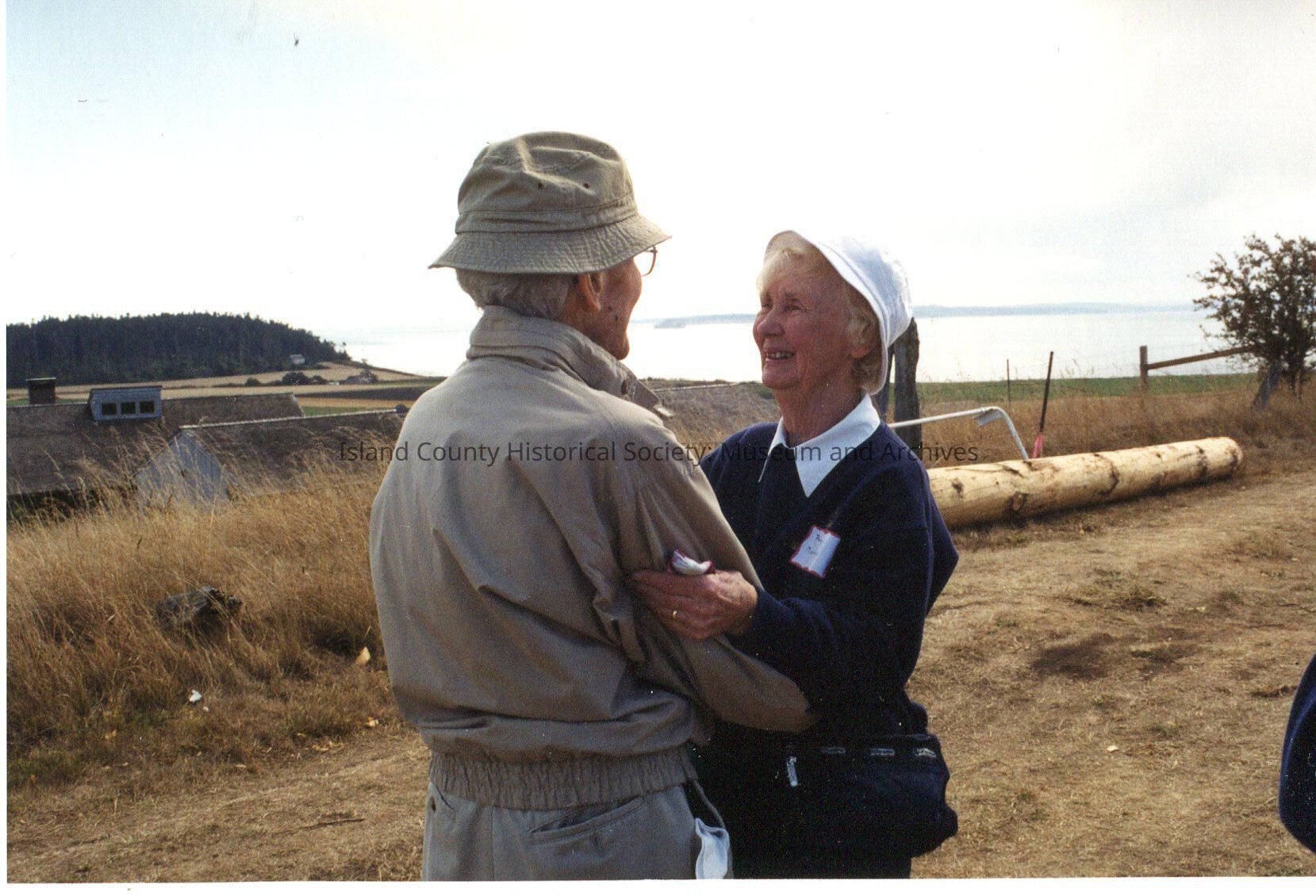 Albert Heath Gathering September 5th 2002 out on Ebey's Prairie, with grasslands, trees and Penn Cove waters in the background. In middle is an elderly couple hugging. Man and women wear fishing hats. He is Albert Heath, looking at the lady. She wears a white hat, white collared shirt and blue sweater.