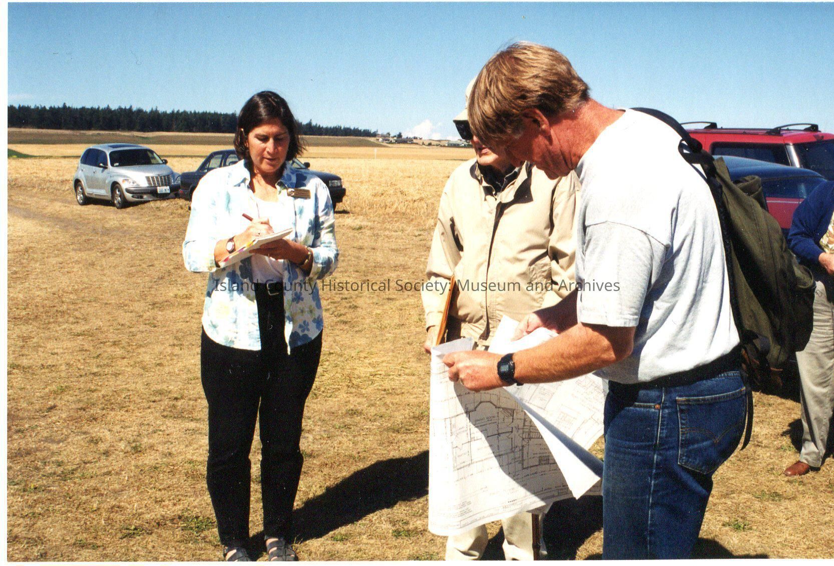 Albert Heath Gathering September 5th 2002 out on Ebey's Prairie.Four people in photo, one person barely visible. Heath in middle with fishing hat and ecru/tan jacket, women in blue is Gretchen Luxemburg.
