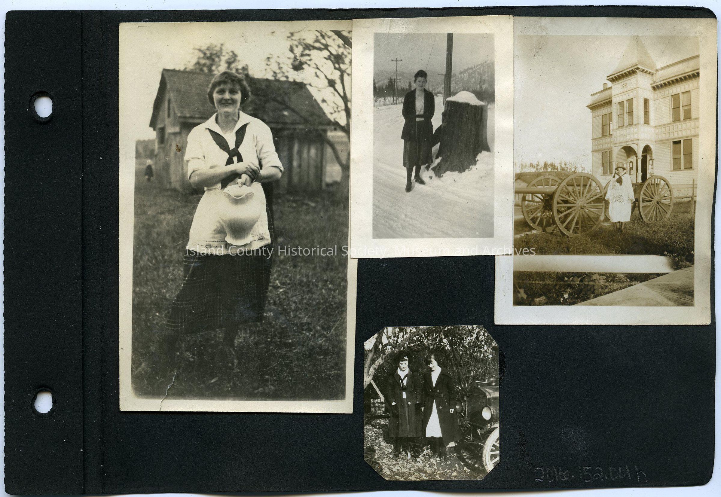Top right: A photo of a woman standing next to a cannon (?) on wheels. She is wearing a white dress and hat with a dark-colored tie/scarf. There is a two-story building in the background. 2.5"x3.5"