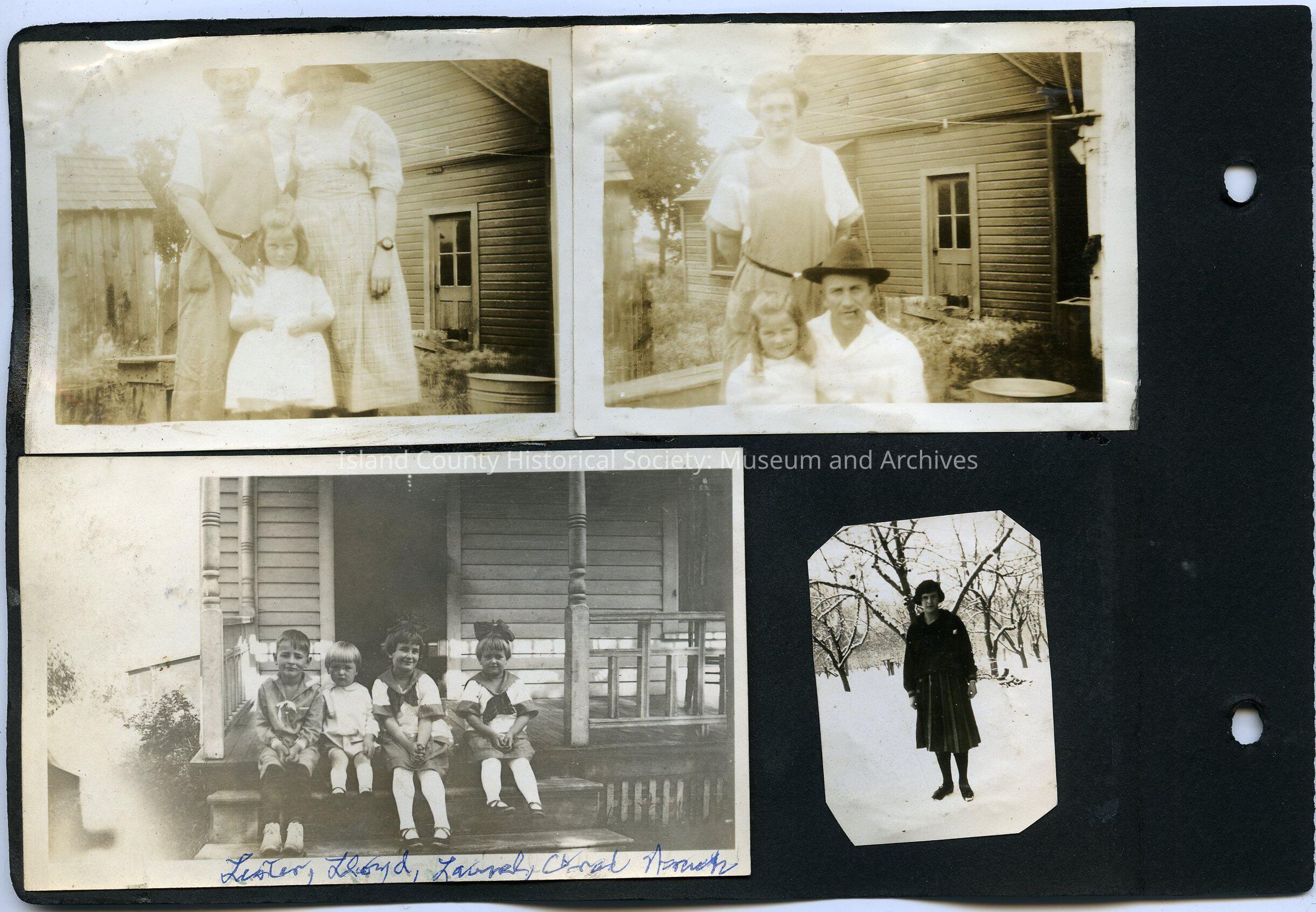 Bottom left: A faded photo of four children sitting on the steps of a porch in front of a house. There are two boys on the left and two girls on the right. Both girls are wearing dresses and have bows in their hair. The left side of the photo is faded. The bottom of the photo says, "Lester, Lloyd, Laurel, Carol Neuman (?)". All four children are looking at the camera. 4.5"x2.5"
