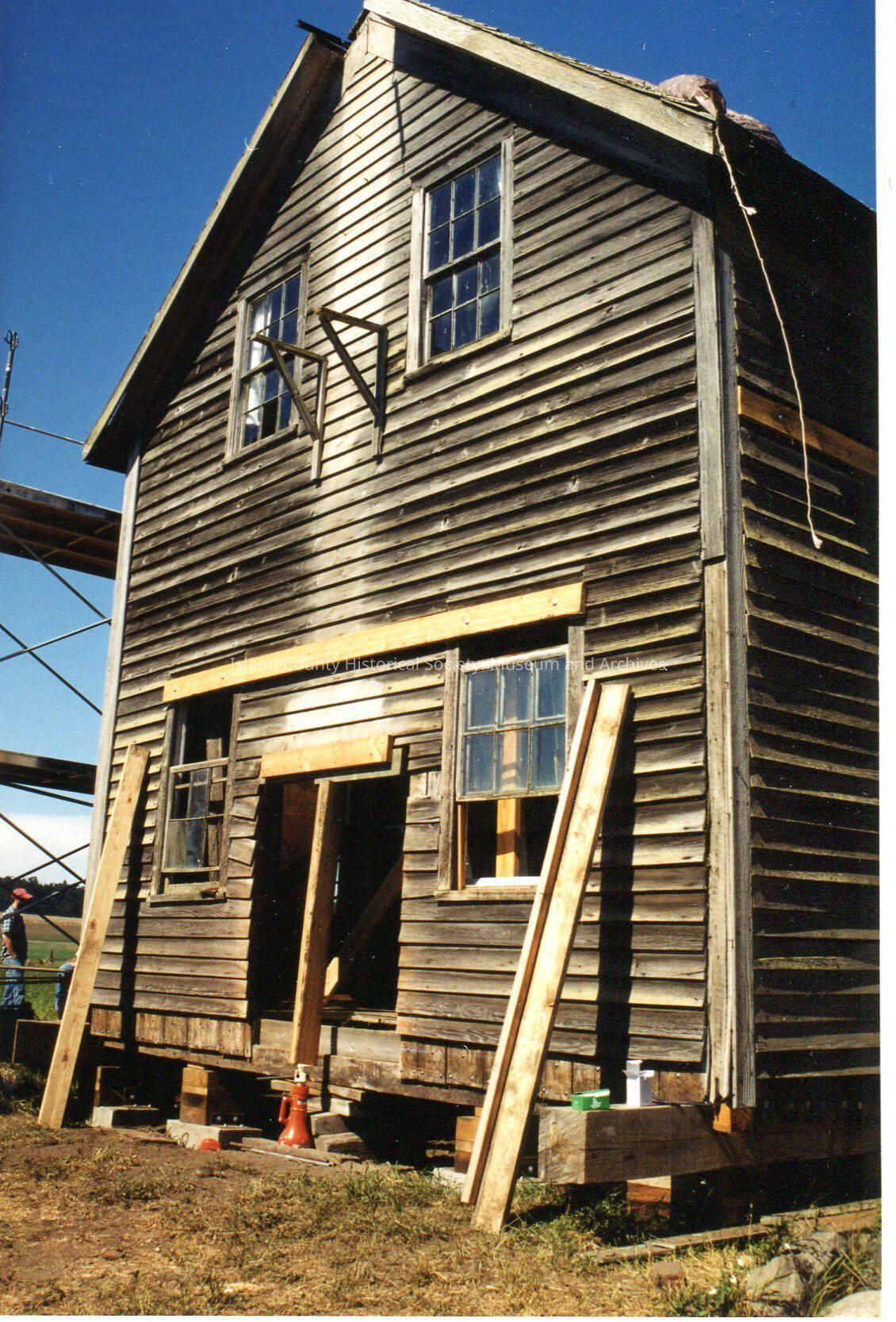 Albert Heath Gathering September 5th 2002 out on Ebey's Prairie. Side view of Ebey's House during restoration project. Four windows, 2 above and 2 below with opening into the house. Two newer, lighter wood planks propped up against it, one on each side of the opening.Lexicon