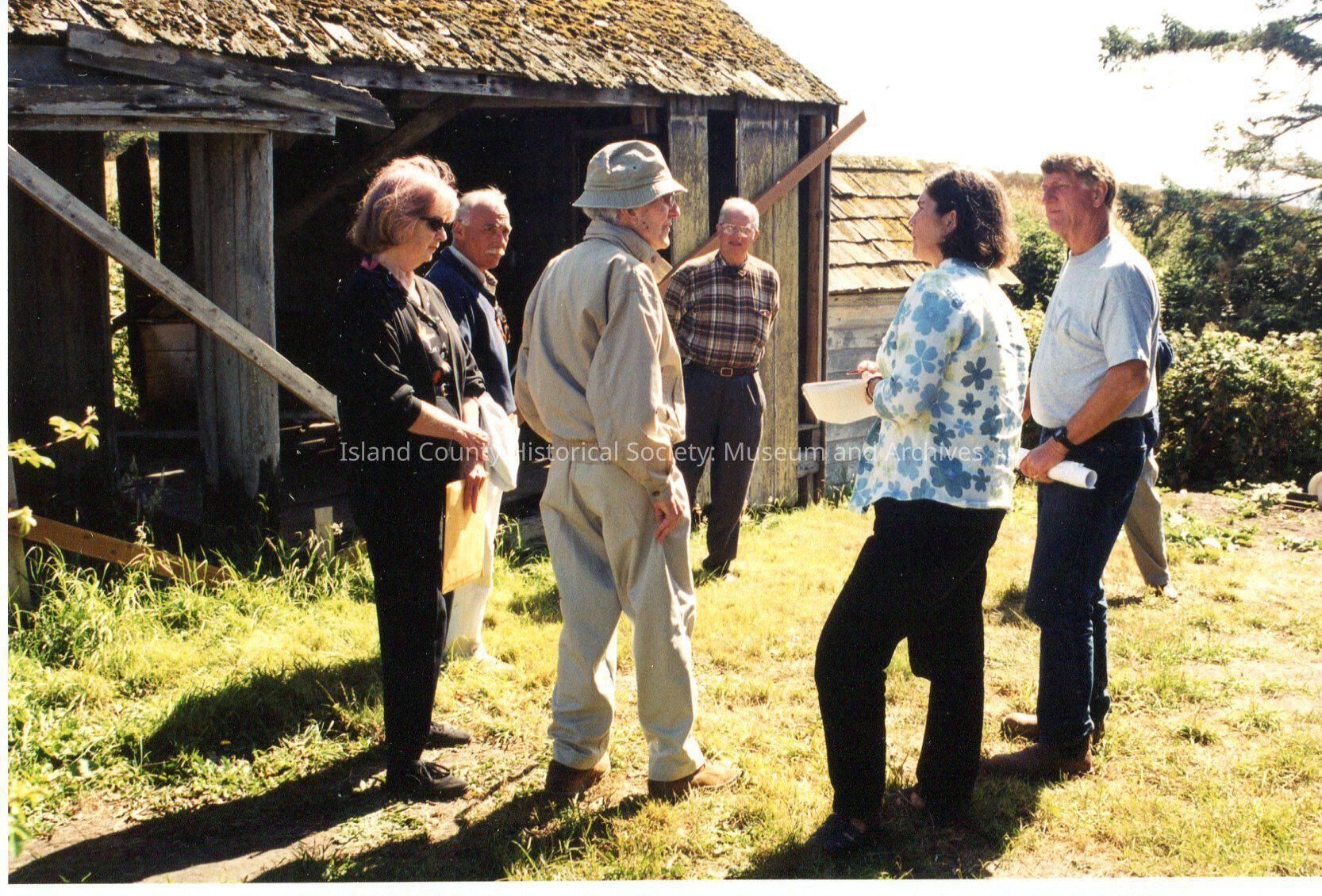 Albert Heath Gathering September 5th 2002 out on Ebey's Prairie. Small group of people stand in a circle outside the Ebey House stables and outhouse. Two women and four men. One of the men is Albert Heath, with ecru/tan fishing hat, jacket and trousers with his back to the camera, standing in between the two women. Gretchen Luxemburg stands to the right in the blue flowered blouse. Sunny outside.Lexicon
