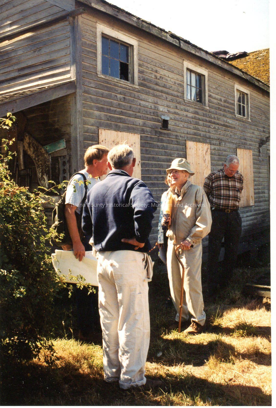 Albert Heath Gathering September 5th 2002 out on Ebey's Prairie. Group of five- four men and one woman- standing just outside Ebey house. Partial view of one side of the house. Albert Heath in ecru/tan hat and clothing, with woman beside him (barely visible) in conversation with two older men. One man stands behind them, looking at the ground. Bottom level of windows boarded up. Sunny outside