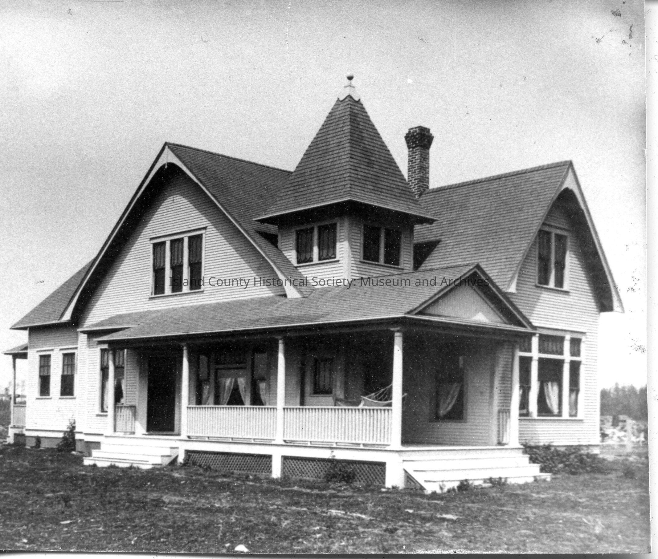A black and white photo of an older house. There are two steps to the porch. And a turret with windows in the middle of the roof.