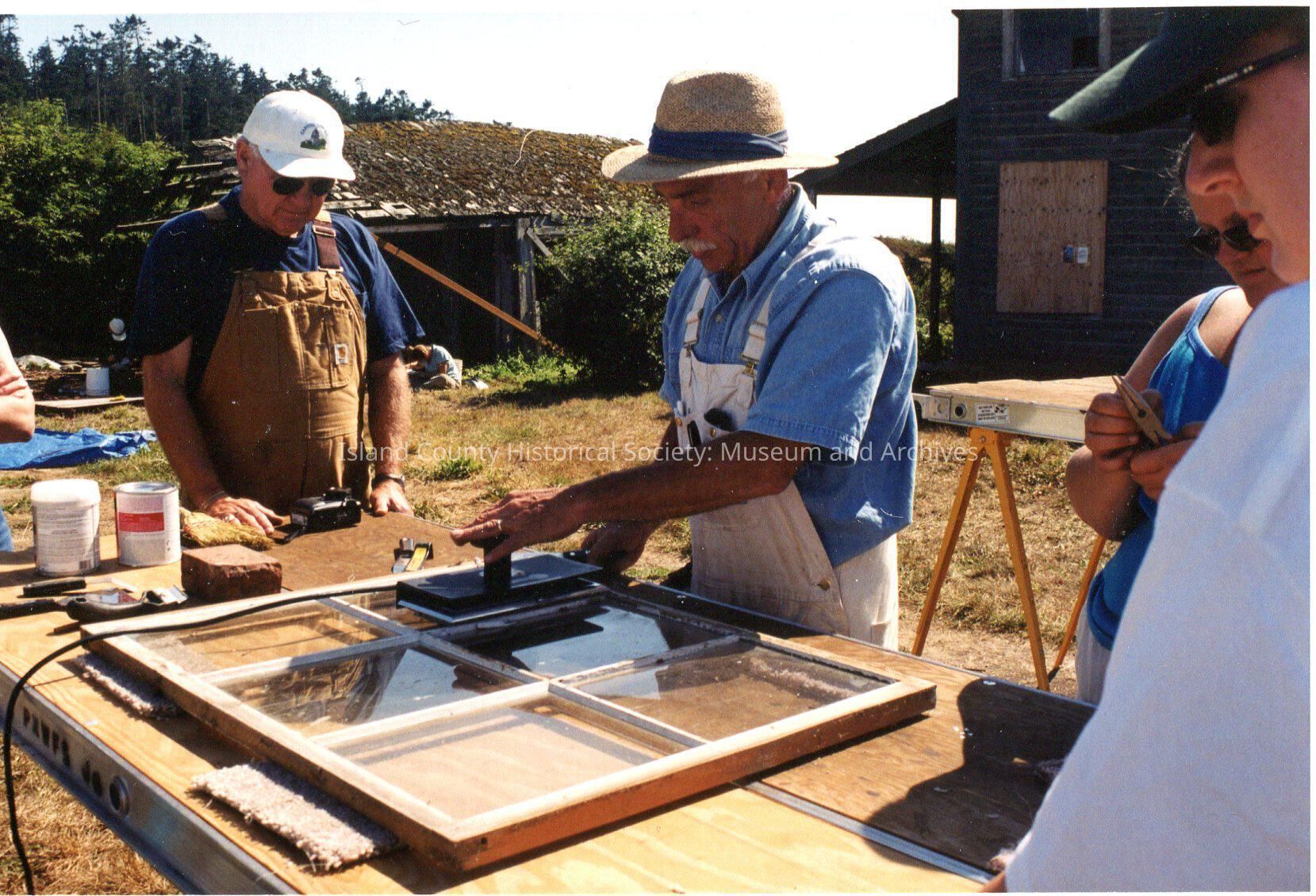 Albert Heath Gathering September 5th 2002 out on Ebey's Prairie. Four people around a workbench watching a man with hat and white moustache working on paned window. Outside Ebey House.