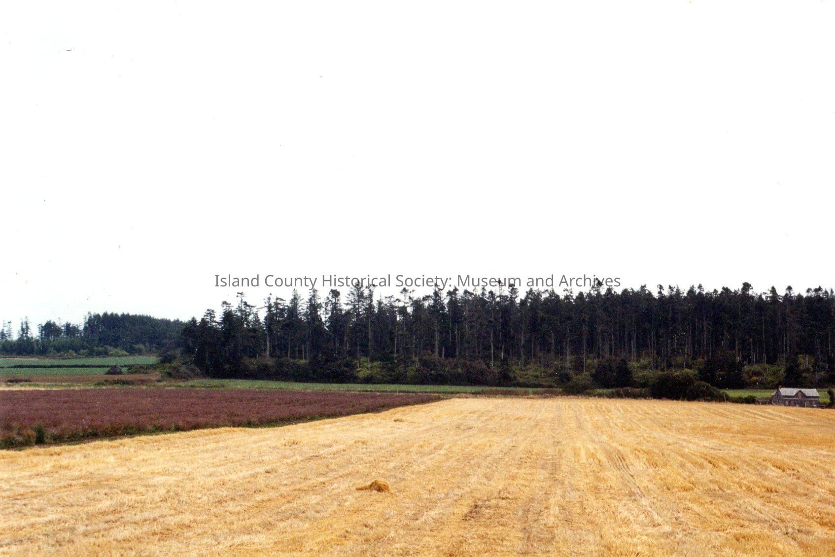 Came in an envelope marked as Ralph Engle House c. 1918. View not of house but of prairie farmland. Hay-like section has been reaped. Further to left of photo is a field of purple-tinged plants. View of house in the distance on the right side of the photo. Tall trees in the background.
