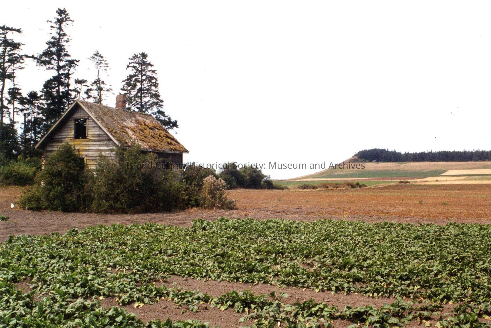 Came in an envelope marked as Ralph Engle House c. 1918. View not of Engle house but of farmland and small house (missing windows, vacant, bit rundown and surrounded by bushes). Low lying plants with floppy green leaves in rows planted in tilled soil. Background og prairie farmland and hill.