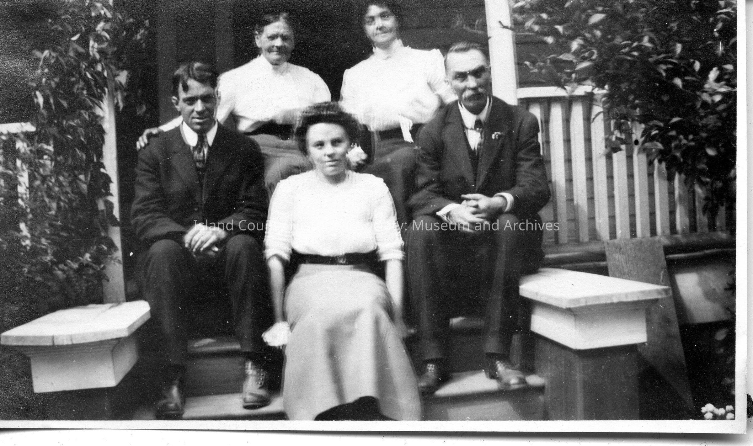A black and white photo of a family outside a house on the steps. Handwritten on the back is "Isaac Power and family. Center front - Margaret, R.F. Isaac." From the old entry: Issac Power & Family. Center front- Margaret. Right Front- Issac