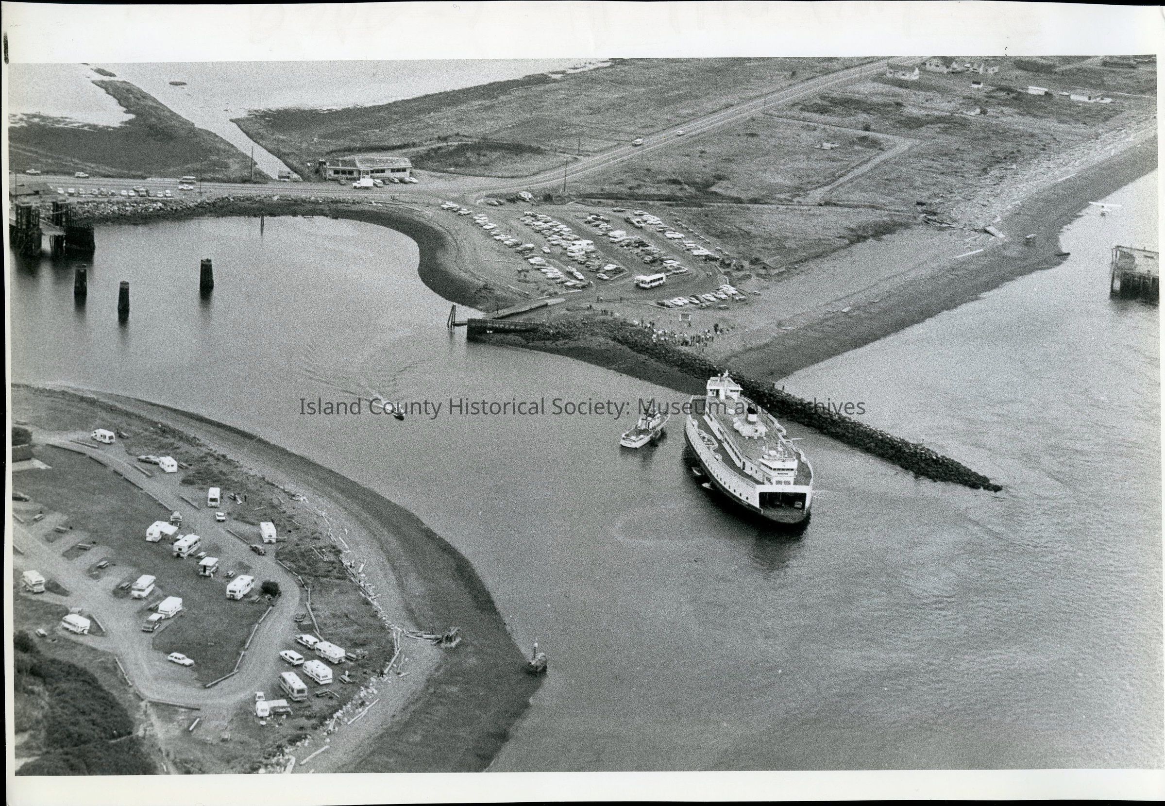 Photograph of the ferry Klickitat sitting aground near breakwater, just off Keystone ferry dock on Whidbey Island. C. August 31st, 1989.Photograph Details