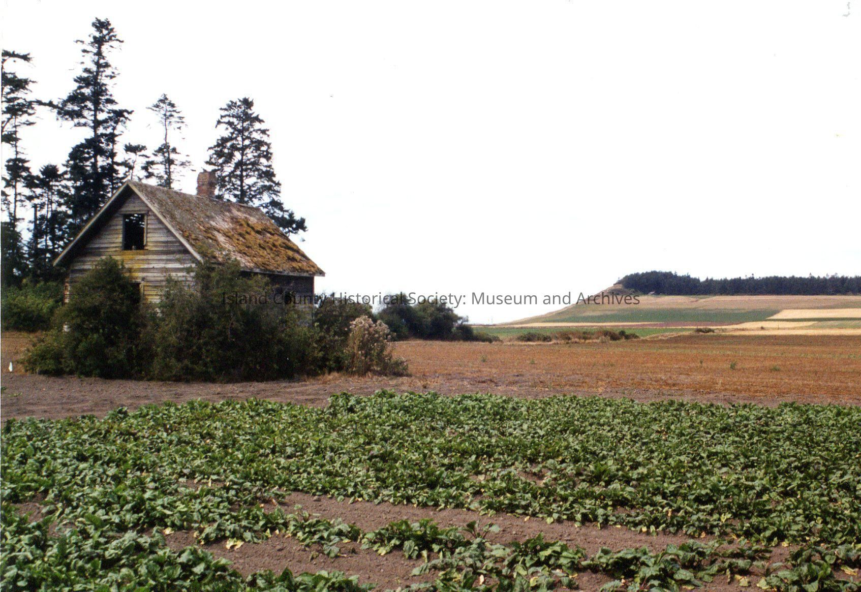 Came in an envelope marked as Ralph Engle House c. 1918. View of small house (empty windows and sinking, mossy roof) surrounded by bushes, on left side of photo. Tall trees behind the house. In the background is more of the prairie and a hill. In front of the house is farmland with leafy plants in tilled soil.