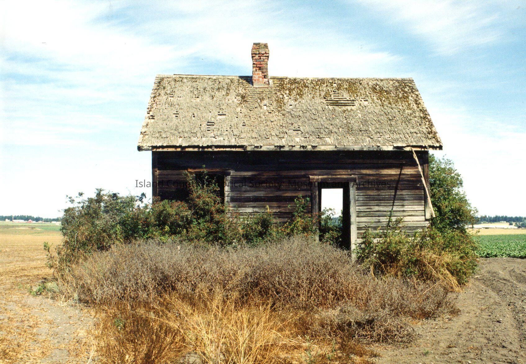 Came in an envelope marked as Ralph Engle House c. 1918. Back side of little house with empty windows, no doors (you can see straight through the house). Brick chimney and mossy roof. Farmland surrounding it and prairie. Part of roofing coming off.