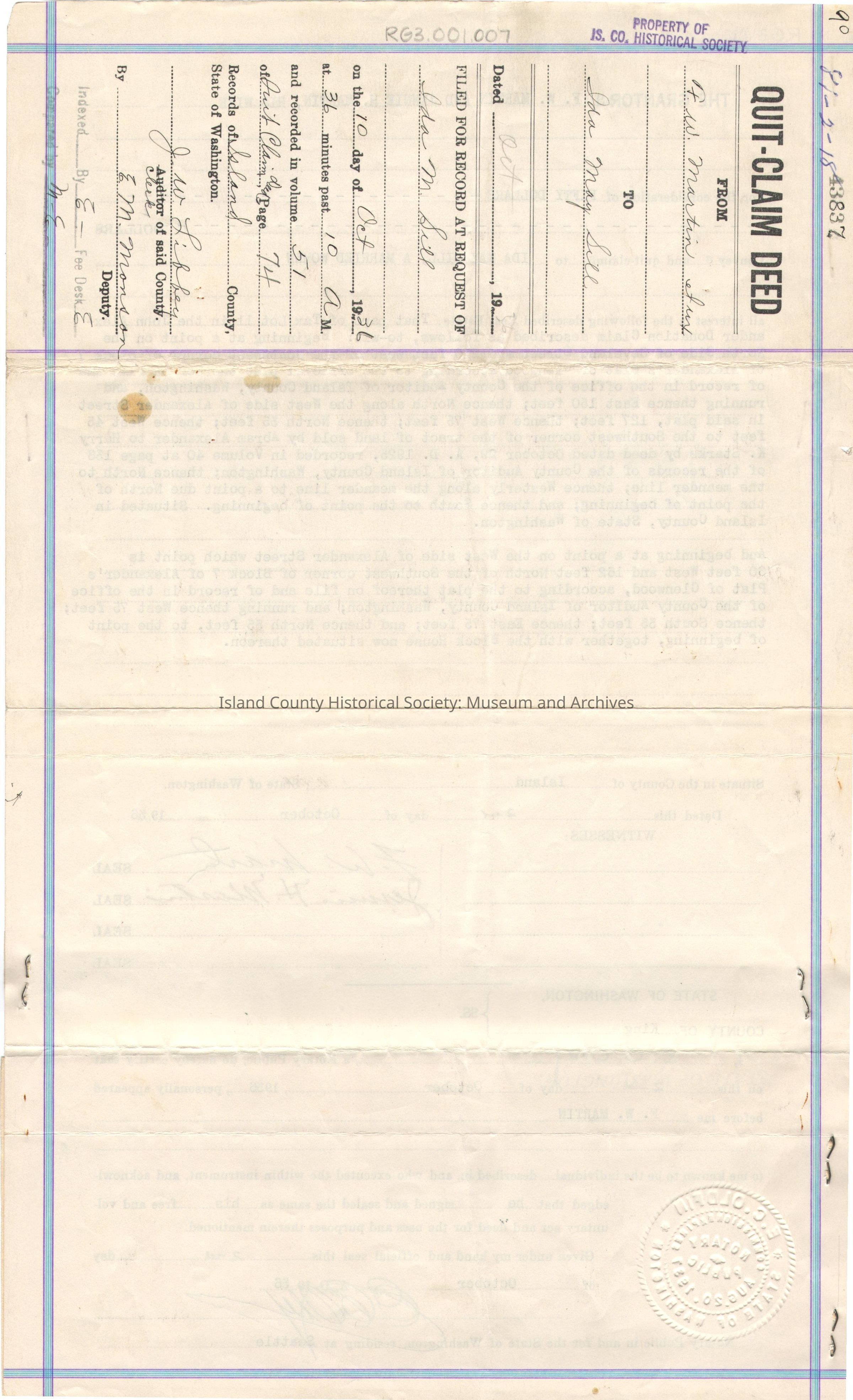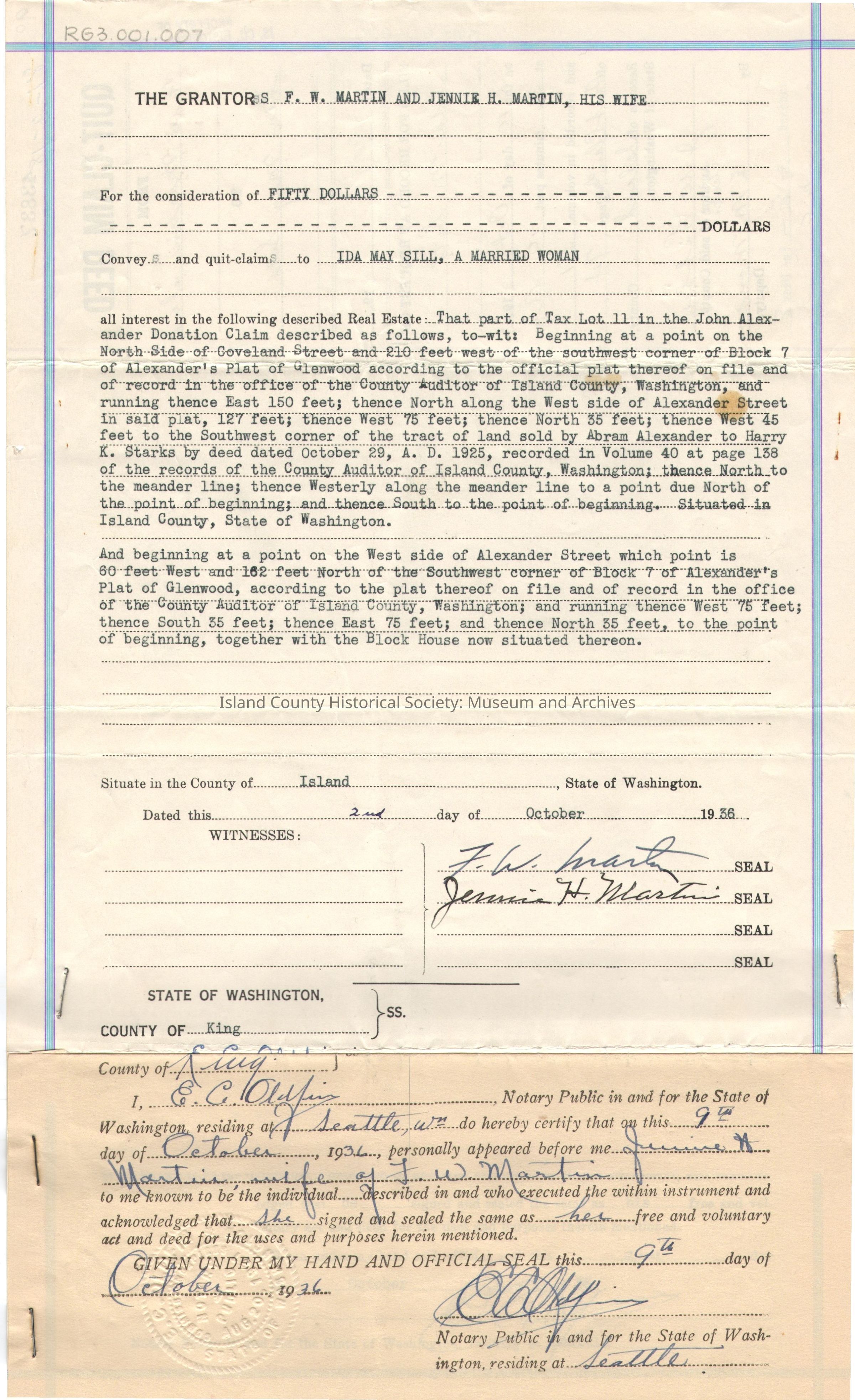 Quit Claim Deed from F.W. Martin and Jennie Martin (his wife) to Ida May Sill