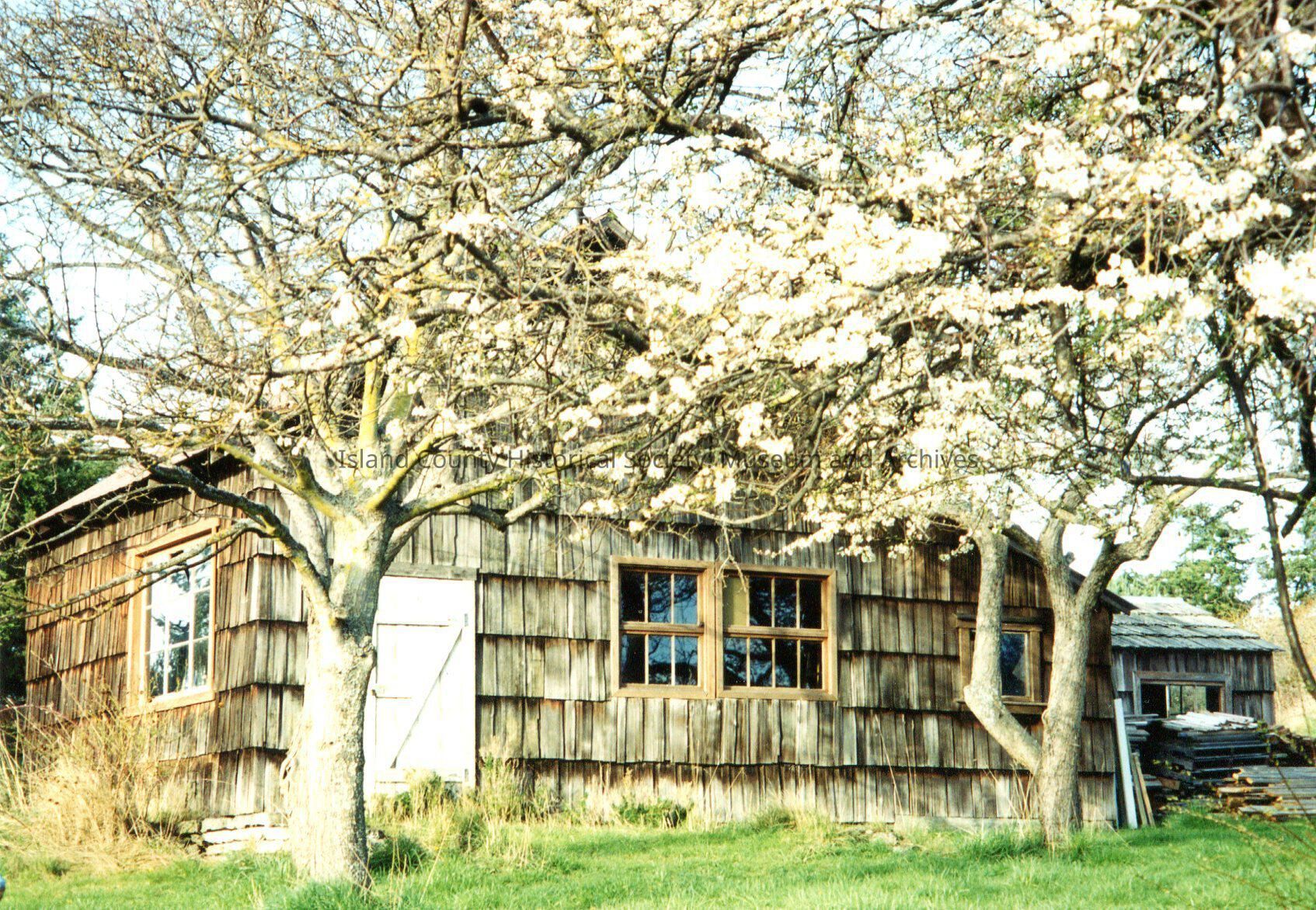 Shot of small wooden house or shed. Wooden exterior- a feathered sort of design, short vertical planks joined up and layered, giving texture to the exterior. One level, with small paned windows. Two sides visible. White door. Low-lying trees around it. Planks of wood and wooden slats on the right side of the photo.