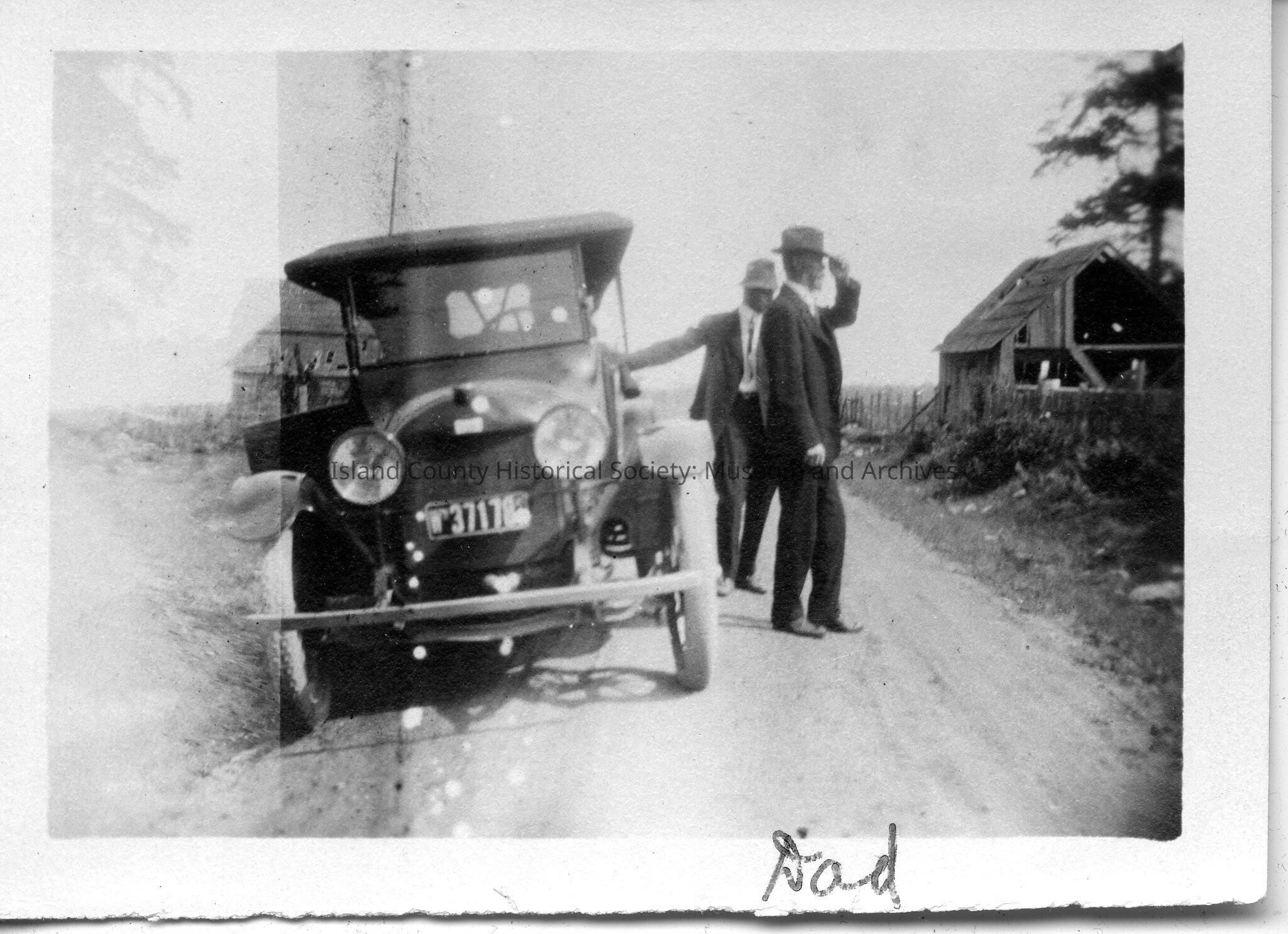 A black and white photo of two men outside an old car on a road. Handwritten on the front is "Dad". Handwritten on the back is "Henry Power?."