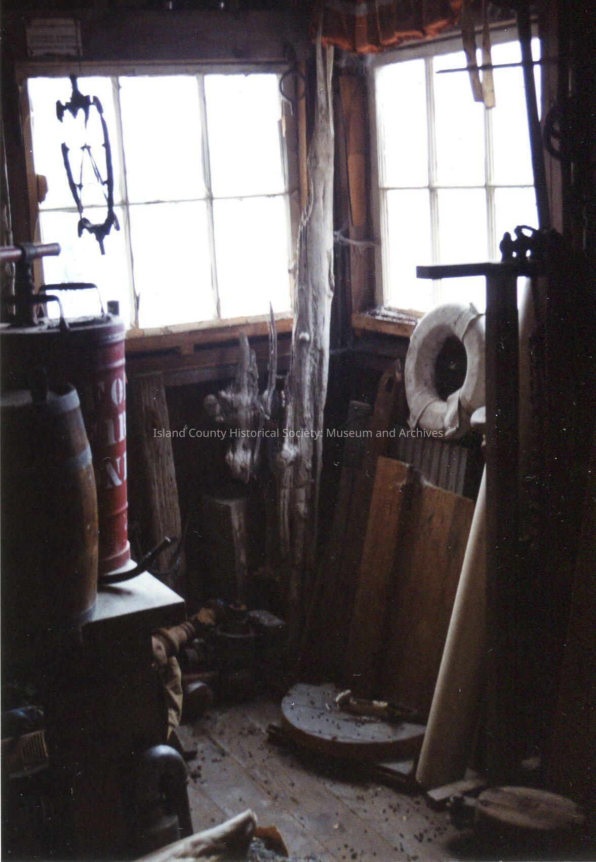 Interior view of Toadhall. View of corner of small room. Windows on either side. Debris on floor. Lots of cobwebs. Red painted can on left. Wooden barrel next to it. Lifesaver ring on left under window. Other scraps and antiques around the place in shadow.