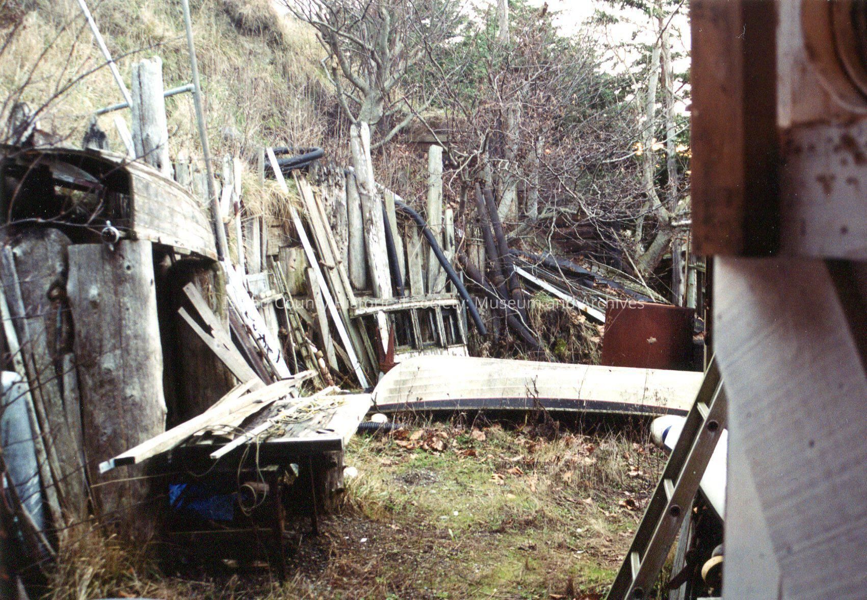 Outside view of Toadhall. Wooden debris all over the ground and lying against a hill. Remnants of two boats upturned- one on the ground and one on the left resting upon four tree trunks. Ladder on right. Trees in background.