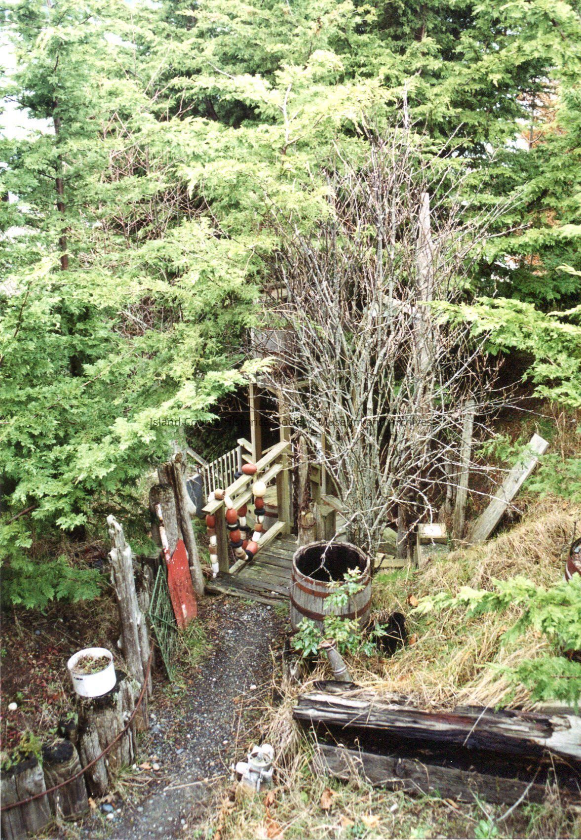 Exterior shot of property. Garden pathway. View looking downhill. Steep gravel path turns into steep wooden rickety staircase. Descends into wooded area. Large wooden barrel for potted plant and semi-circular area on left side in foreground for planting.