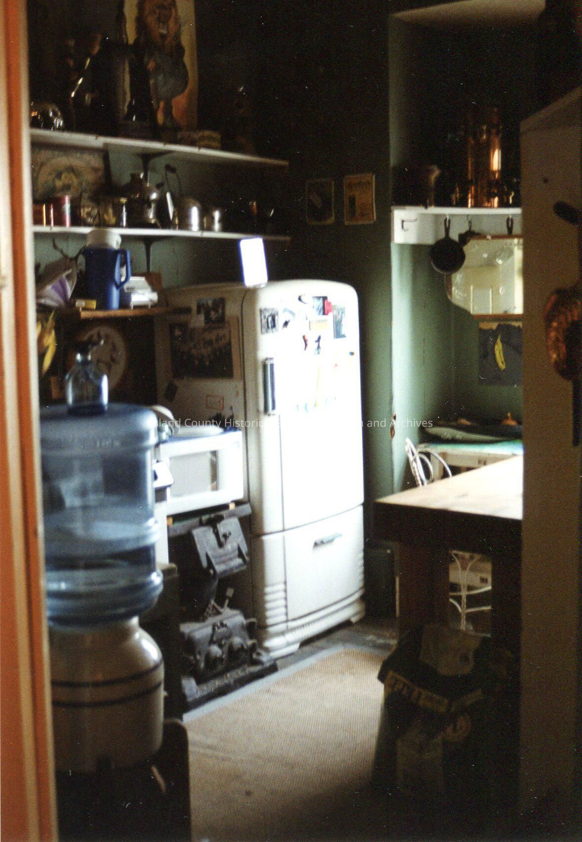 Almost identical to 2016.133.229. Camera shifted ever so slightly to the left. Interior shot of kitchen. Shelving on left beside and around fridge and microwave. In foreground on left is a water tower dispenser partly empty/full. Green walls. Crockery and antiques around the room. Thin rug on floor. Wooden work table partially visible on right. Framed by doorway.