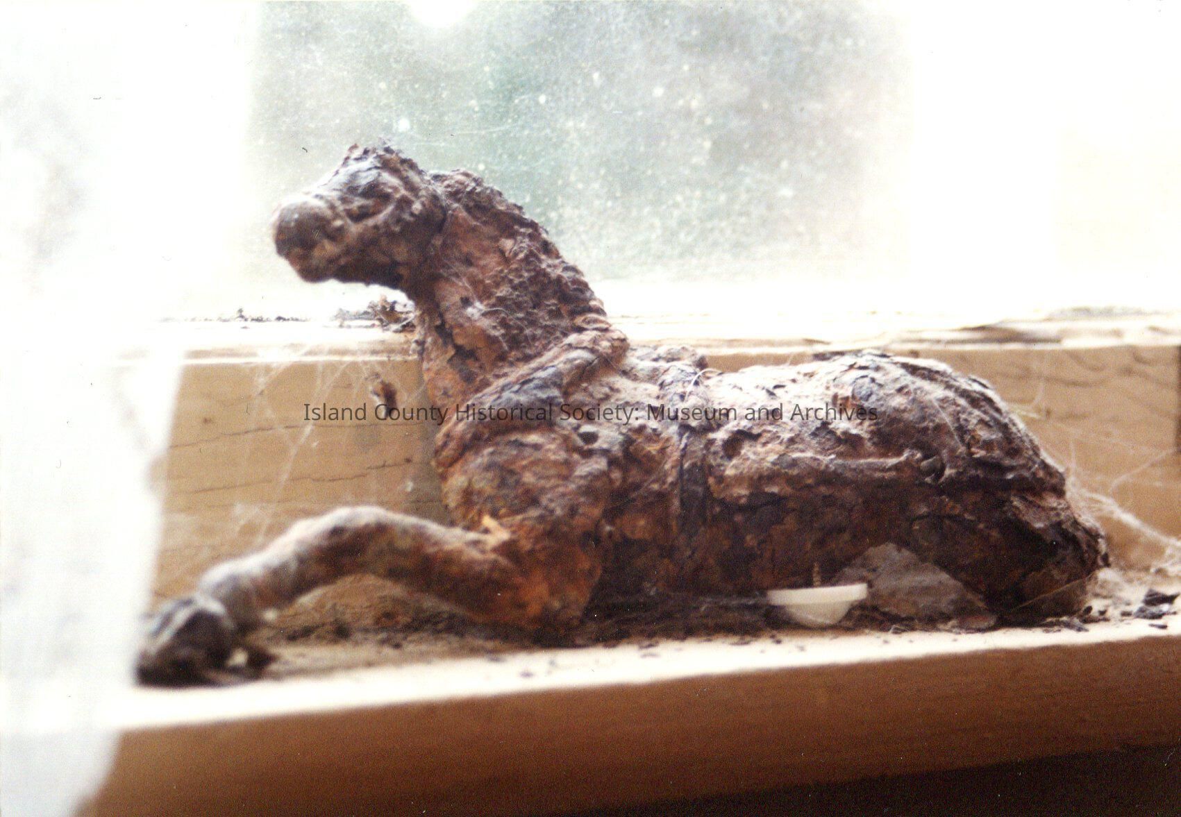 Close-up shot of antique item on a window sill. Covered in cobwebs. Horse (toy?) little statue, broken and corroded