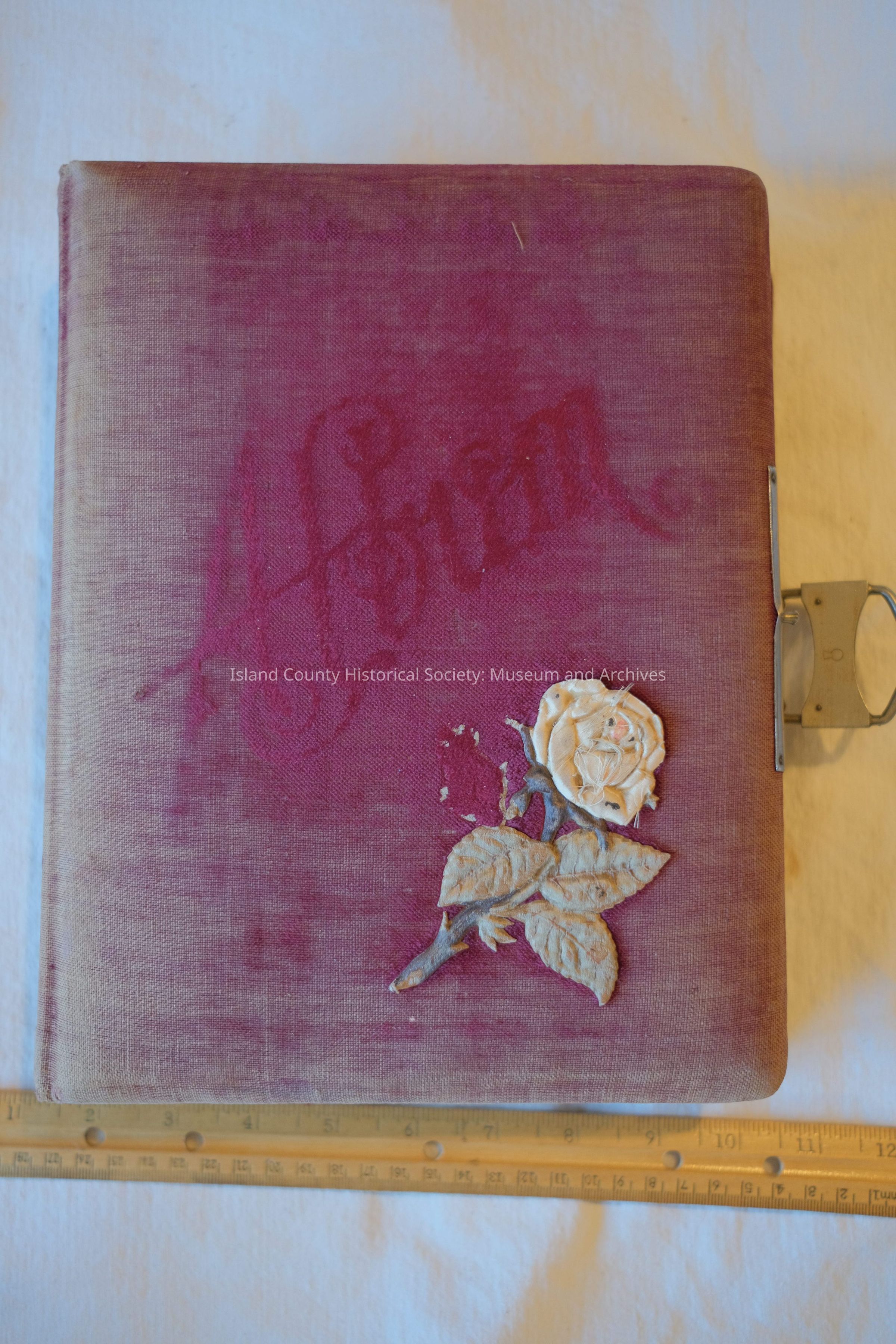maroon velvet photo album w/ white rose on cover - very worn - Kaehler/Jenne family photos - Coupeville and SeattleCollection
