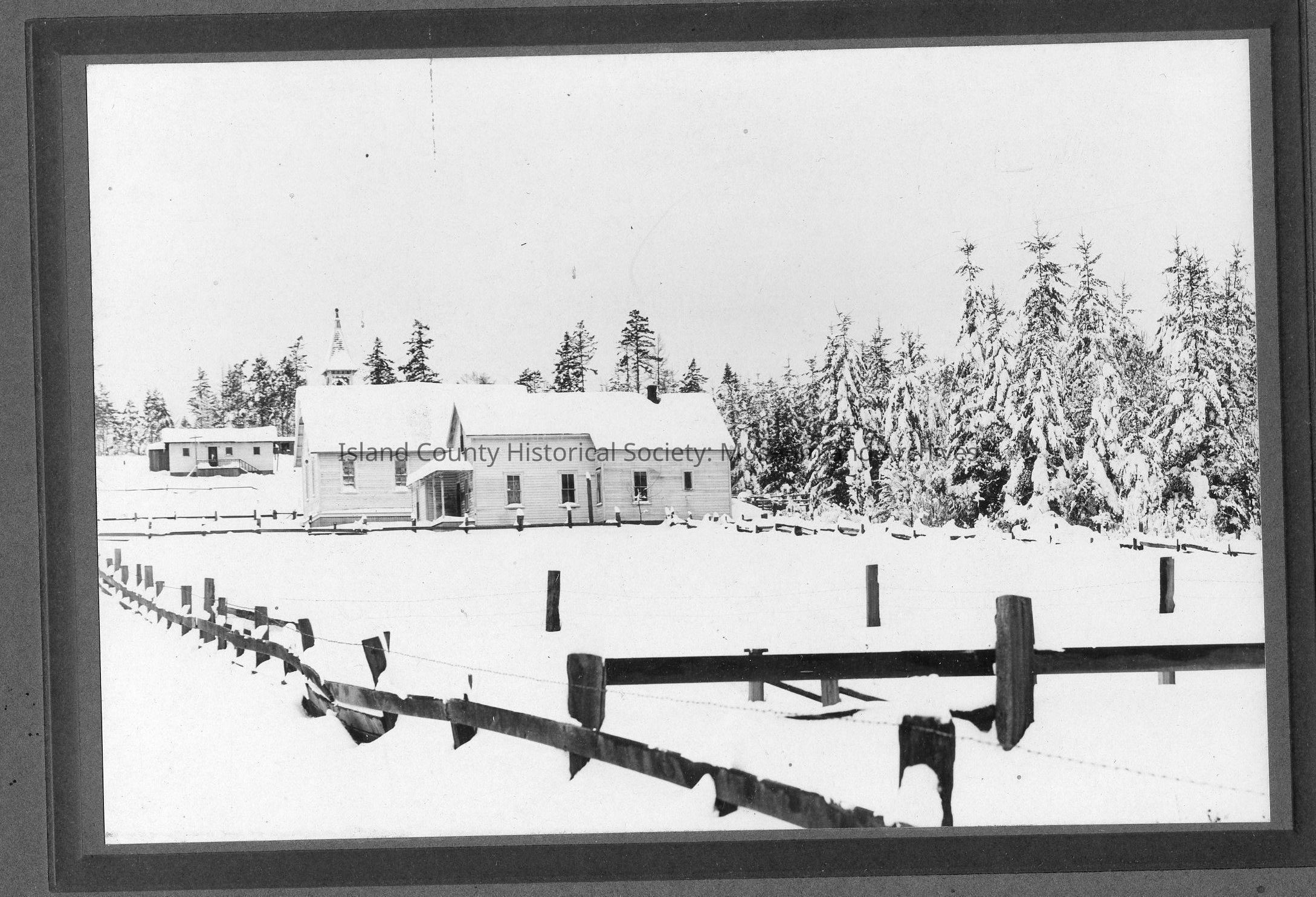 B&W photo of Methodist Church and Parsonage at Crescent Harbor in the snow.Photograph Details