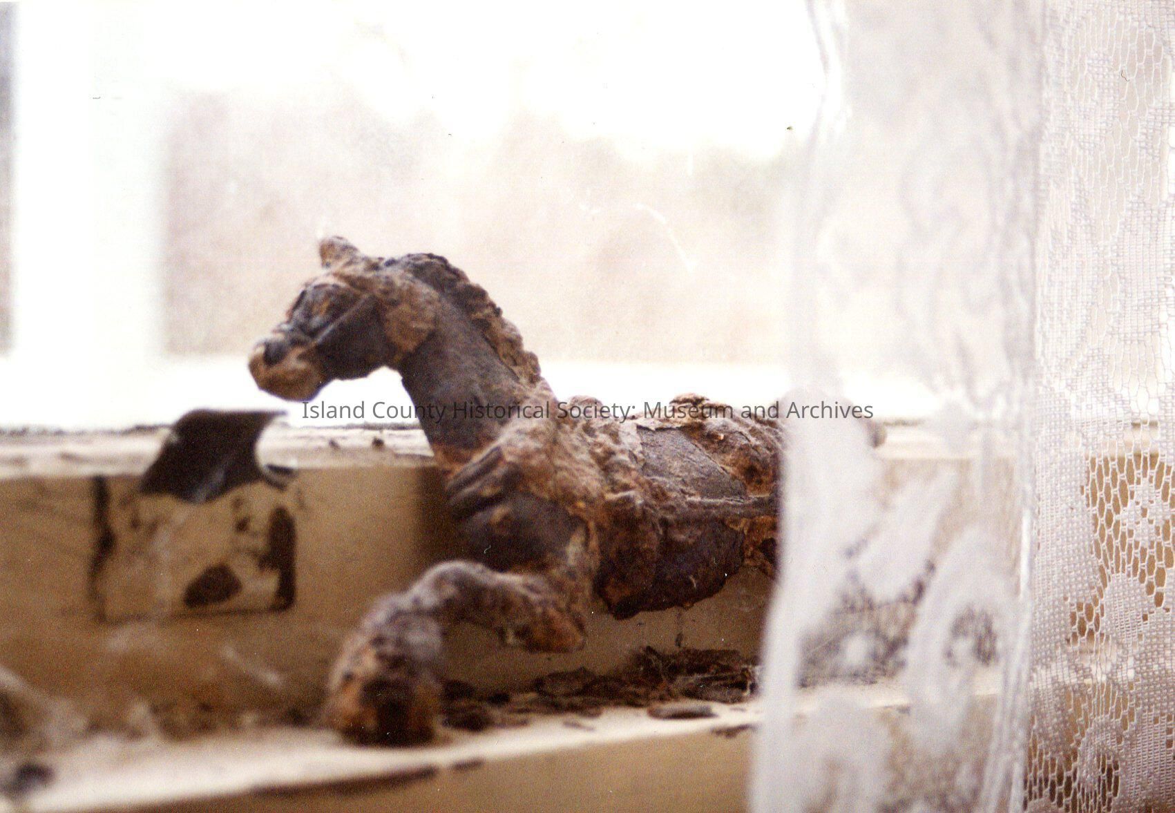Close-up shot of antique item on a window sill. Covered in cobwebs. A horse (toy)- little statue, broken and corroded. Bits of it collected in pile underneath horse's belly on sill. Lace curtain drawn.