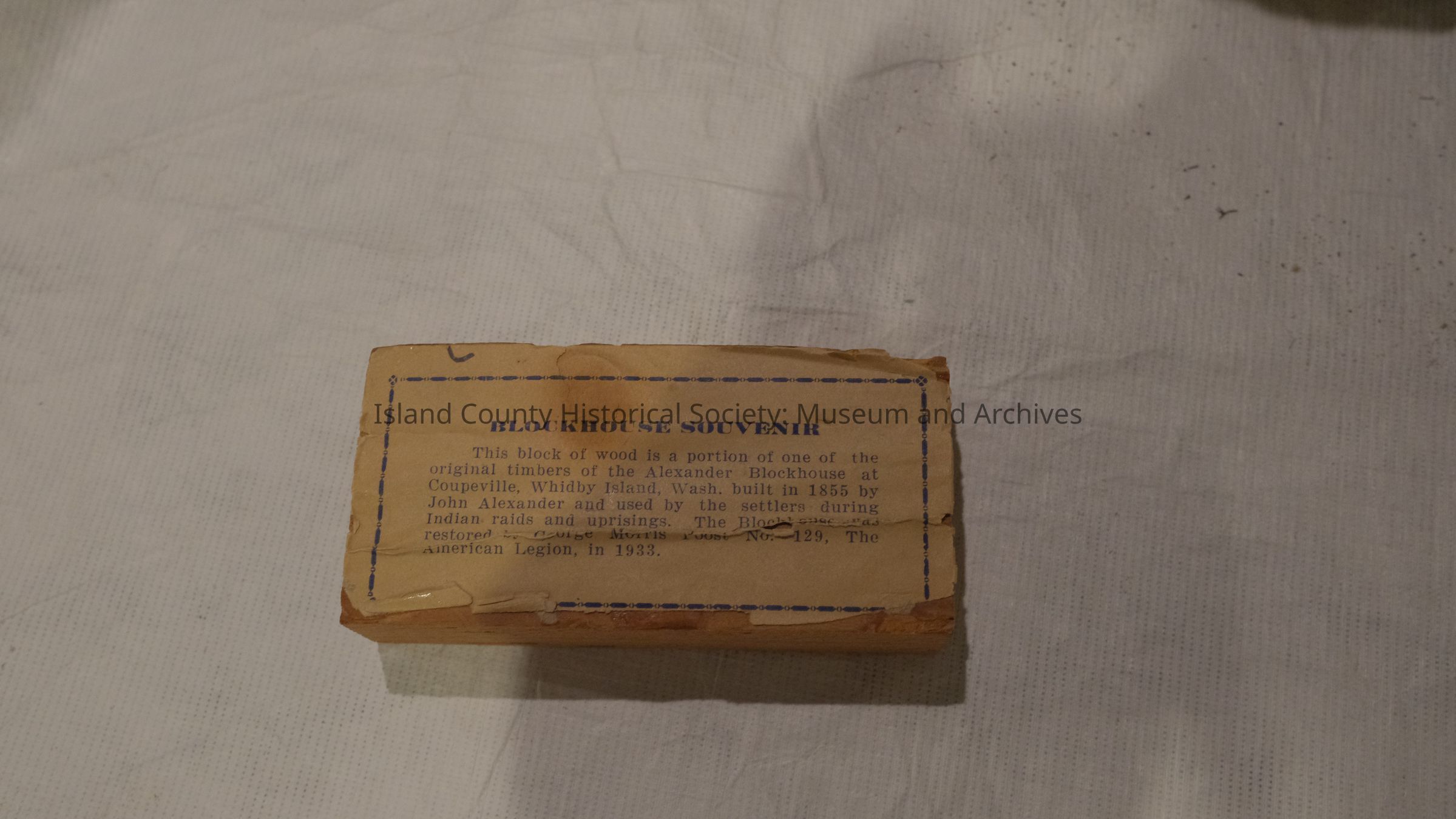 This block of wood is a portion of one of the original timbers of the Alexander Blockhouse at Coupeville, Whidbey Island, Washington. Built in 1855 by John Alexander and used by the settlers during Indigenous raids & uprisings.