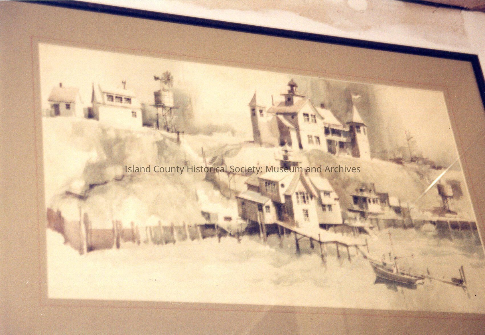 Almost identical to 2016.133.237. This photo has ever so slight lighter exposure. Photo of watercolour (?) painting most likely by Richie Benson. A fantasised version of Toadhall and surrounding area. Toadhall on pier with boat on water directly in front of it. No trees on hill behind the house. Another fairytale castle like house on the hilltop on the right of the photo. On the left of the photo, on the hilltop are two smaller houses and a water tower. A smaller water tower is on the beachfront to the right across from Toadhall.