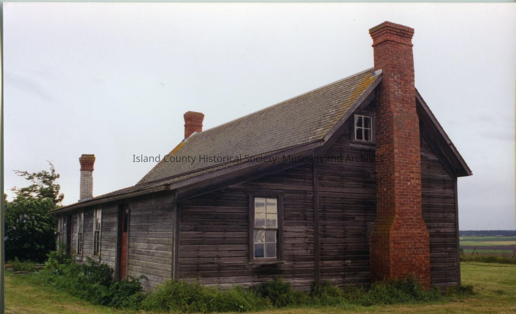 Jacob and Sarah Ebey House. Of corner, so two sides of house showing. All three brick chimneys visible. Ebey's Prairie surrounding it. Main building has two floors evidenced by low level paned glass window and one above next to the chimney, smaller but also paned. Triangular roof with a bit of moss on it. Another section joins on to this main part (on left side of photo). Two doors coloured red-brown, one level with sloping roof and three paned glass windows, two of which are between the two doors. Grass grown up around the base of the house, though shorter further away. Trees and bushes on left, behind furthest chimney.