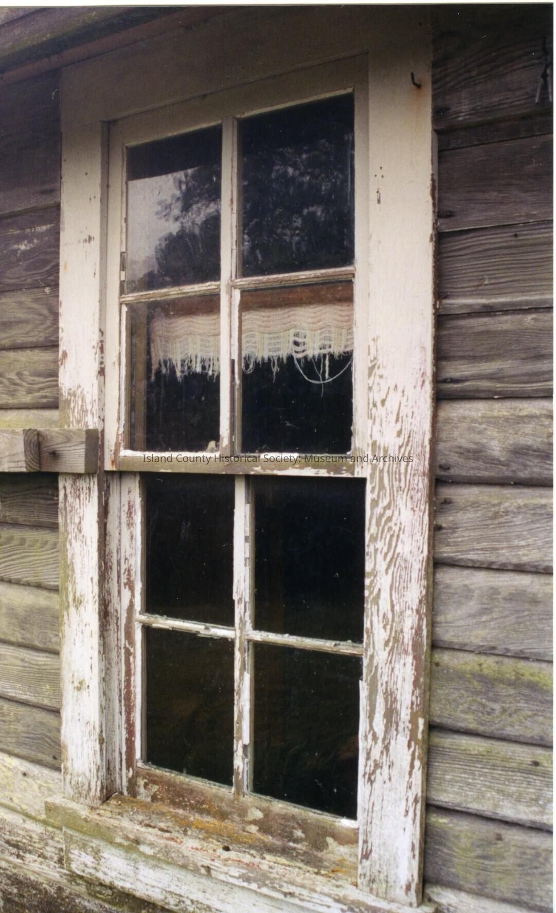 Jacob and Sarah Ebey House. Close-up of one window. White frame, paint flaking off, moss and lichens growing on the wood. Eight window panes, four panes of equal size to one section of the window- window is meant to slide down/up to let in fresh air. Possible remnants of a white curtain are inside, going lengthwise across the bottom two panes of the upper half of the window. Pairie land reflected slightly in the glass.