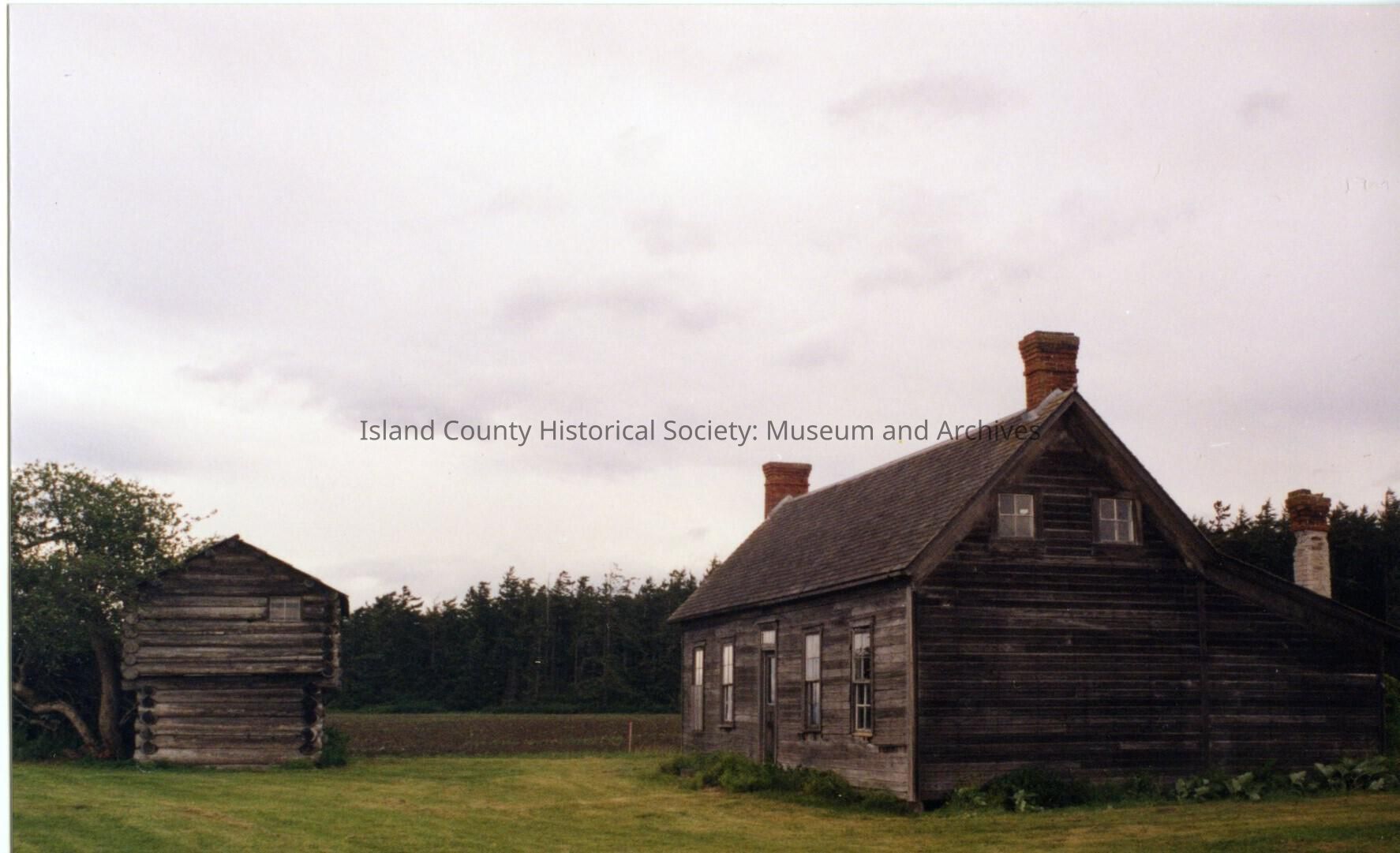 Jacob and Sarah Ebey House. Exterior of house from some distance, photo shot including view of the blockhouse across from house. Two sides of the house visible. Prairie grassland, farmland and trees surrounding and in distance. Side of building has two small paned windows on upper floor. On other side- front face of building- main door with two windows either side. One level and roof sloping down rather than other section which has triangular roof.