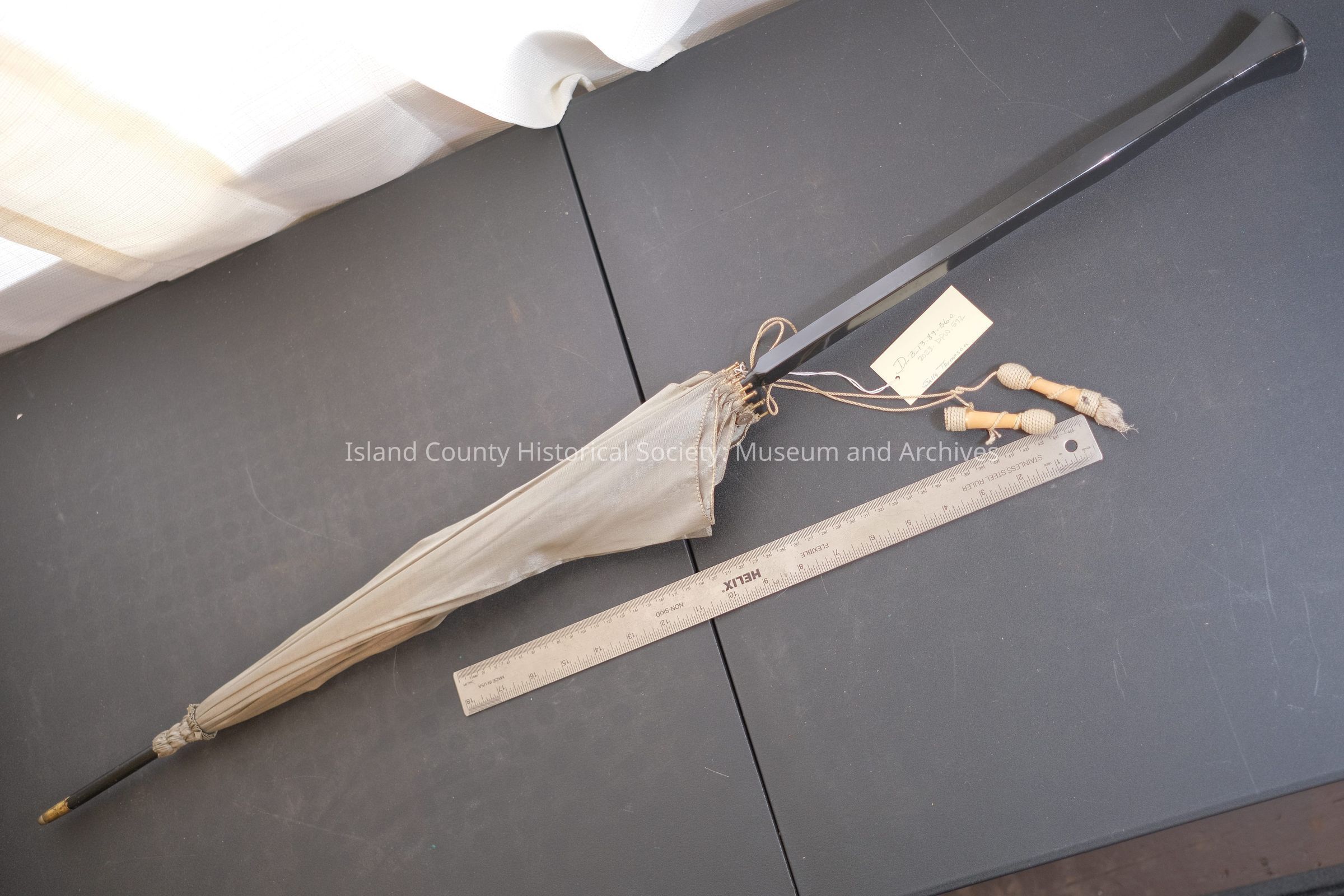Silver gray w/ long black handle and silver tassles