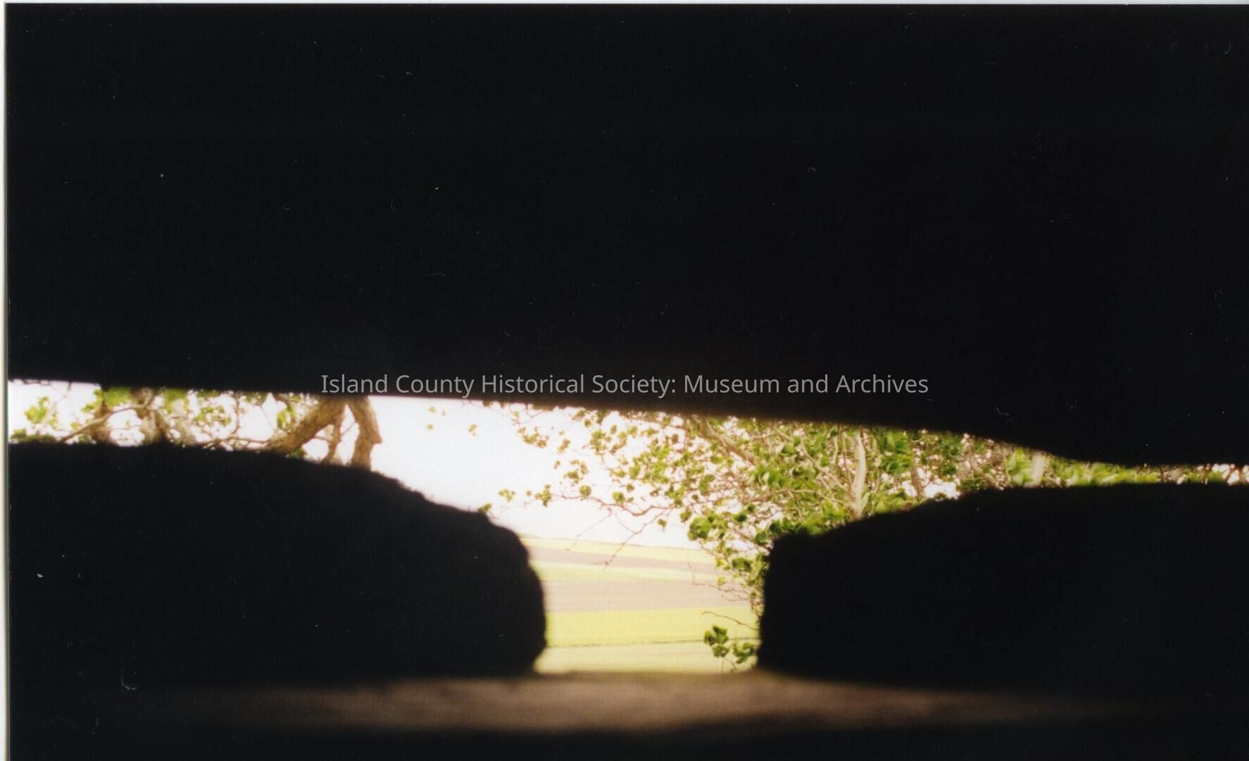 Jacob and Sarah Ebey House. Close-up photo looking from inside to the outside through a slit in the wall. Through the gap you can see bright sunshine, and branches with small green leaves. Wooden slats of the wall are in shadow.