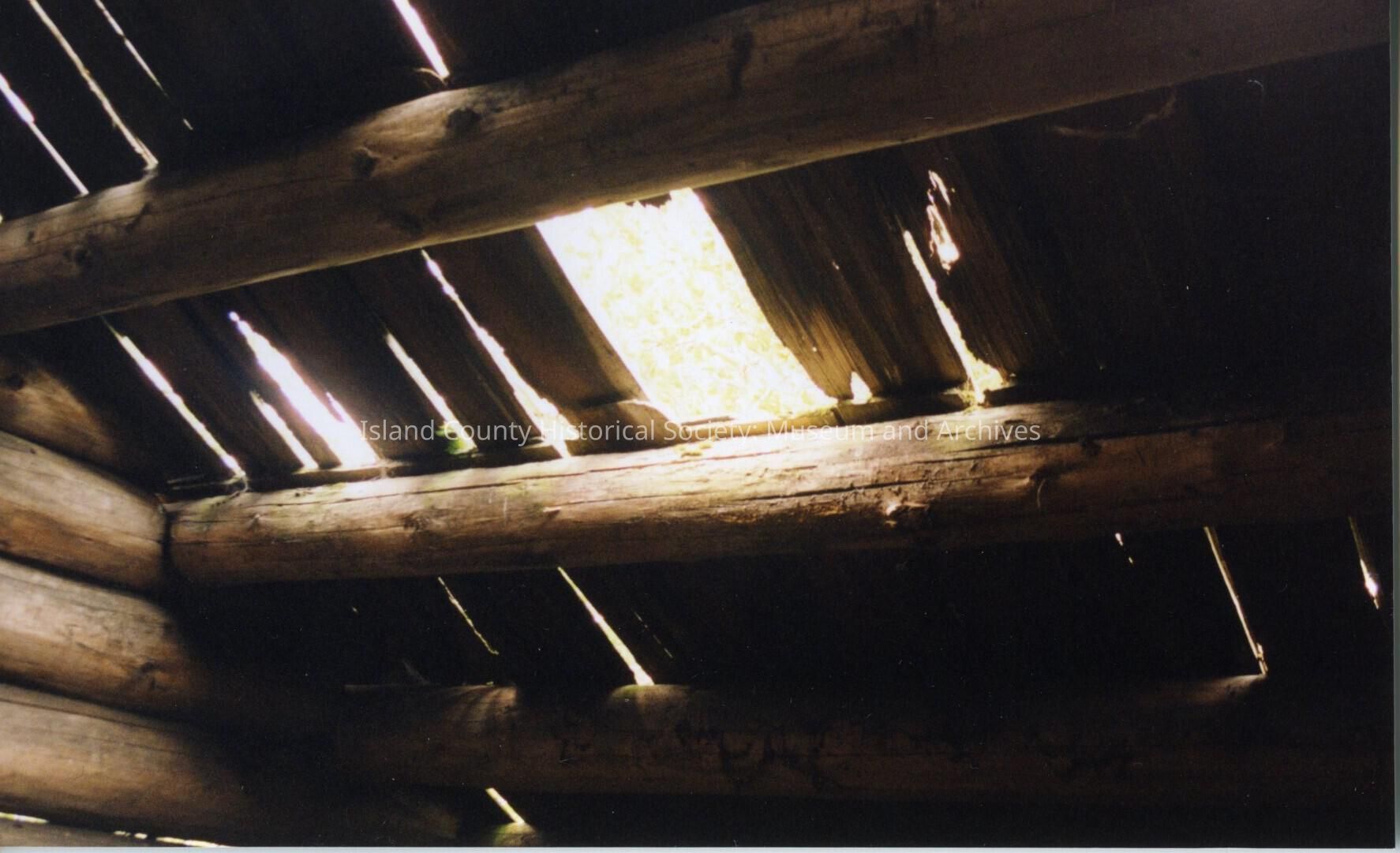 Jacob and Sarah Ebey House. Close-up photo of part of the roof, looking up from the inside of the house. Whitish sunlight filters through the gaps in the wooden slats that make up the roof. There is a particularly large rectangular gap in the roof in the middle of the photo. The roof slats that slope are flat and oblong whilst there are cylindrical logs that support these slats from below.