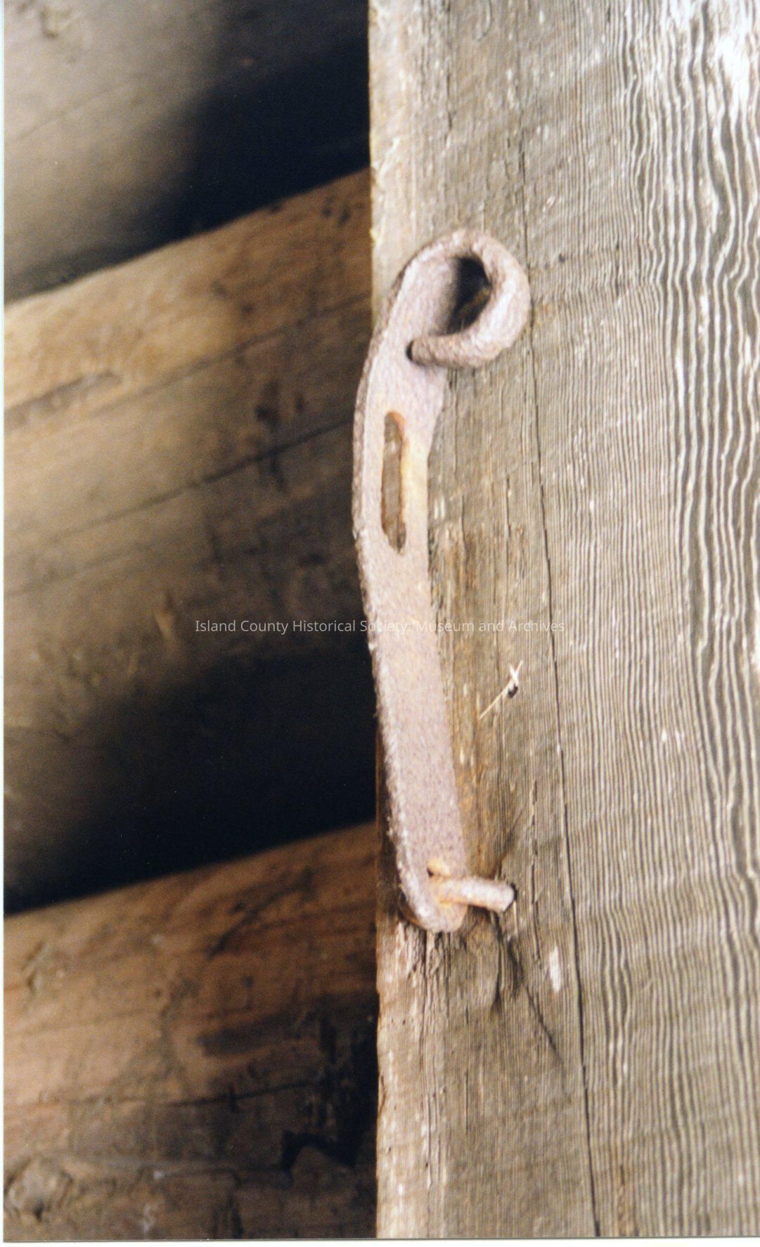Jacob and Sarah Ebey House. Close-up photo of handle attached to entranceway. Metal has corroded. Attached by a metal ring, also corroded. The top of it curls over and about 2/3rds of the way up is a slit. Light shines upon it.