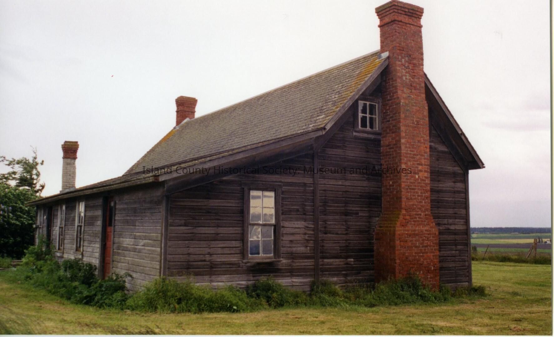 Jacob and Sarah Ebey House. View of exterior. Same view as 2016.133.246, but this one is taken a few feet further back from the house. All three chimneys- brick- are visible. Two sides of the house are visible. One side is the backside of the house where it is only one level and the roof slopes downwards. Visible are two doors with two windows between them and one window to the left of the door furthest away. The other side shows the two levels to the main house. One window near the roof top. Full view of chimney. One window on the left of this side, part of the add-on one-level sloping roof section of the house. Grass surrounding. Prairie in the background. Tree in background on left of photo.