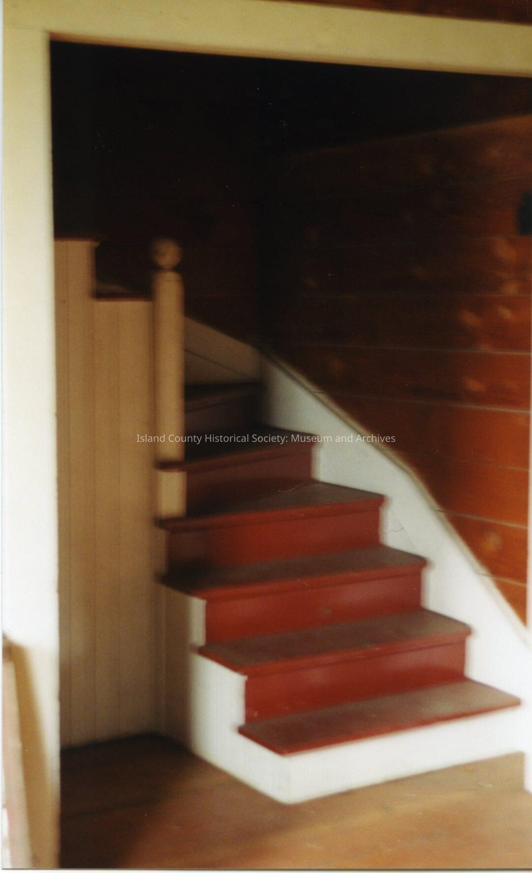 Jacob and Sarah Ebey House. Blurred photo of interior showing staircase. This part has been restored noticeable by the different colouring of the wood and painted wooden staircase (white and brown). Steps are quite whide. No railing visible, though there is a white painted newel - upright oblong body with globular head. Low ceiling.