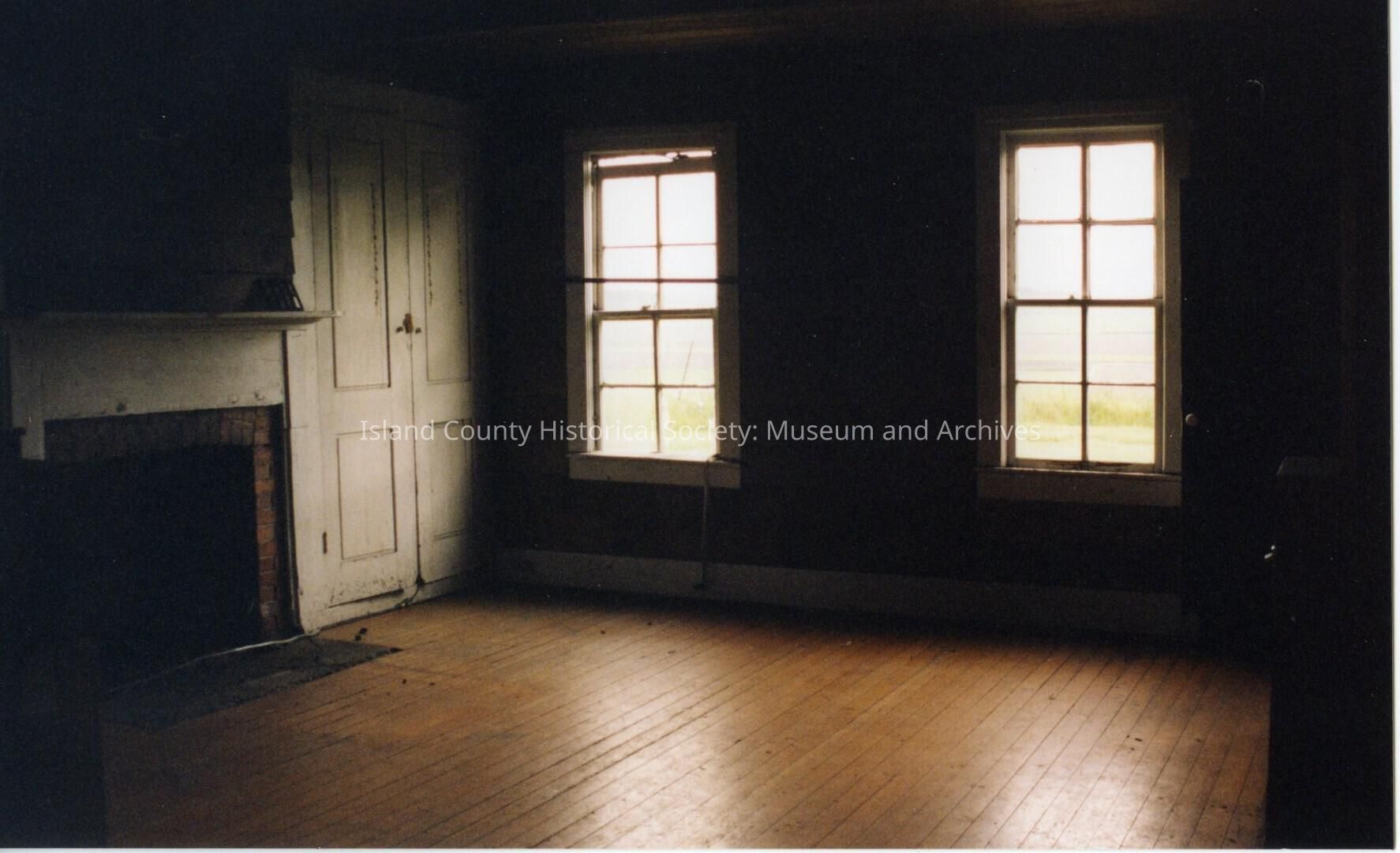 Jacob and Sarah Ebey House. Interior shot of room, quite dark despite the light coming through two windows (with view out to the prairie). Flat horizontally laid wooden slats for the floor. White painted baseboard. Closet on the left hand side is painted white. White framing for both windows and white framing for the fireplace to the left of the closet. The window on the left hand side has a bar across the upper section of it. Also the window top section appears to be a bit open- either broken or has been slid down. Open door mostly in shadow to right of window (furthest right).