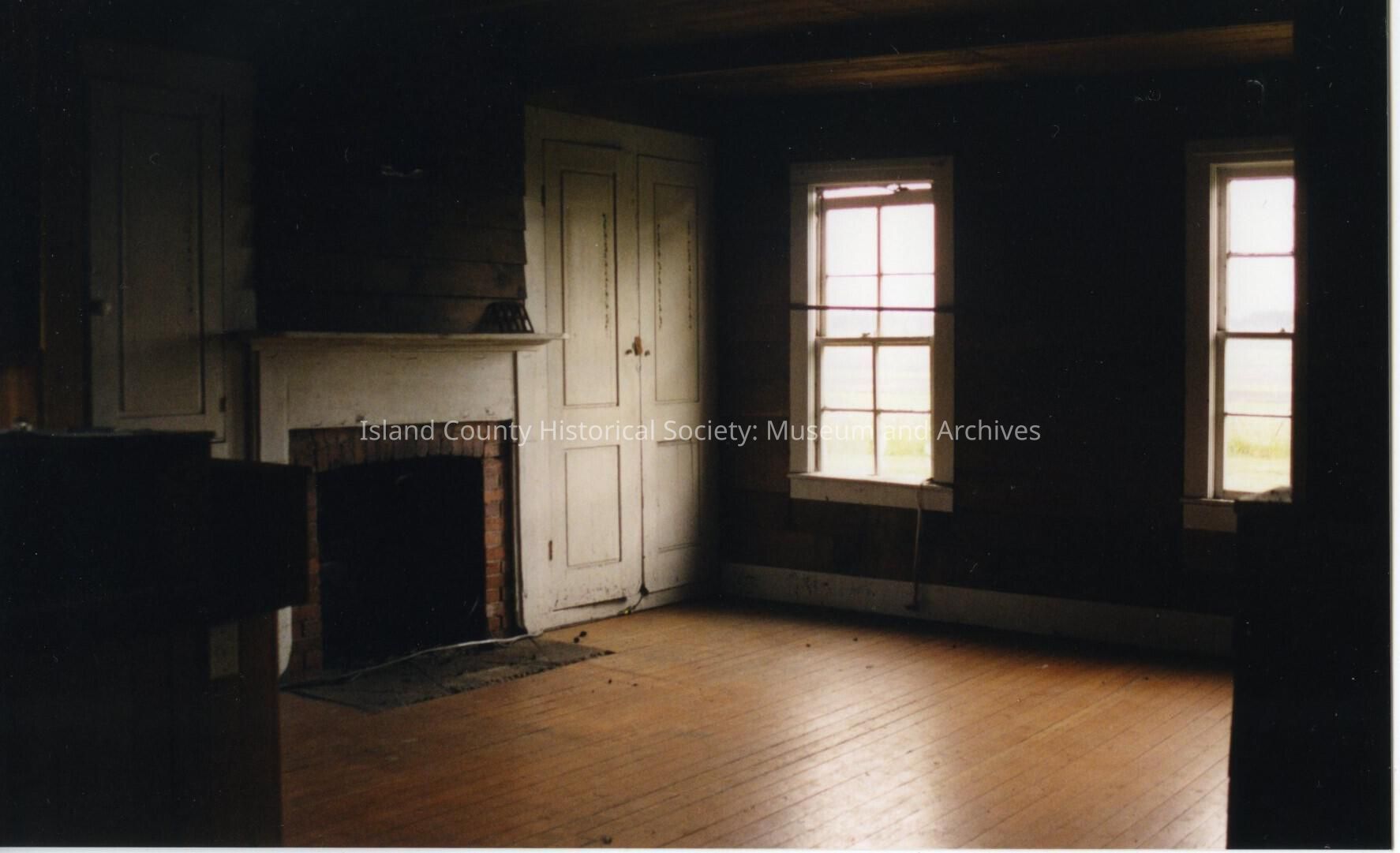 Jacob and Sarah Ebey House. Similar to 2016.133.261 but further to the left. Interior shot of room, quite dark despite the light coming through two windows (with view out to the prairie). Flat horizontally laid wooden slats for the floor. White painted baseboard. Closet on the left hand side is painted white. White framing for both windows and white framing for the fireplace to the left of the closet. The window on the left hand side has a bar across the upper section of it. Also the window top section appears to be a bit open- either broken or has been slid down. Partial view of the window to the right. To the left of the brick fireplace is another smaller one-door closet set into the wall and is also painted white.