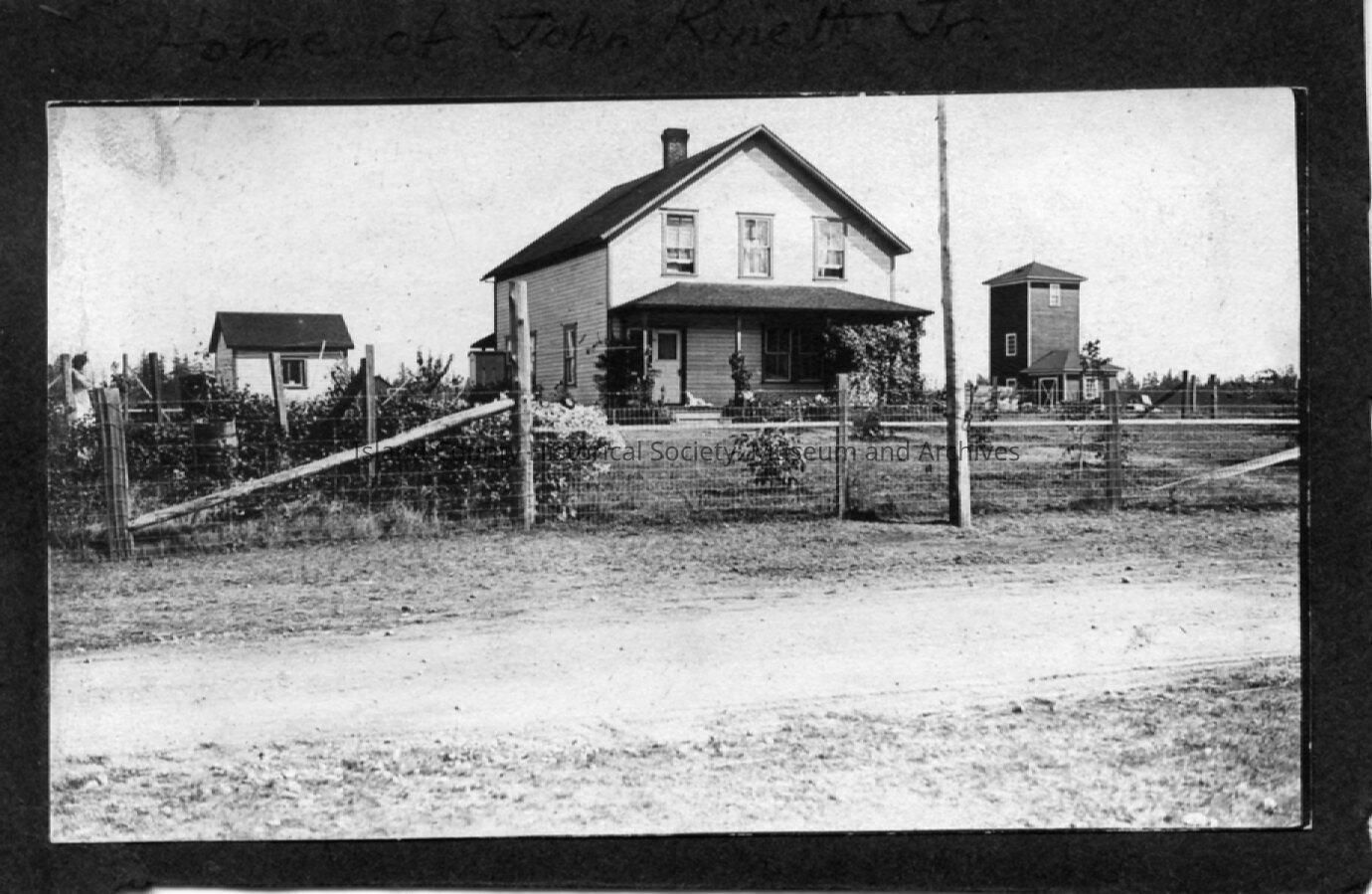Kineth farm on Smith Prairie. House with wide front porch faces road with fence. Garden and small shed on left. Granary on right. John and Jane Kineth Jr. farmhouse constructed in 1900 of lumber shipped from the Seattle-Tacoma area. A local carpenter was contracted to build the house as well as the dairy barn, wood shed and pumphouse. The house has remained unchanged with later additions being made to the pumphouse, and the construction of a workshop in 1913. The house remained in the Kineth Family until c 1970 when it was sold to Virginia Canty. George Lloyd the current owner bought the house in 1974 and operates an antique business in the barn to this day 2019. Located at 183 South State Highway 525 Coupeville