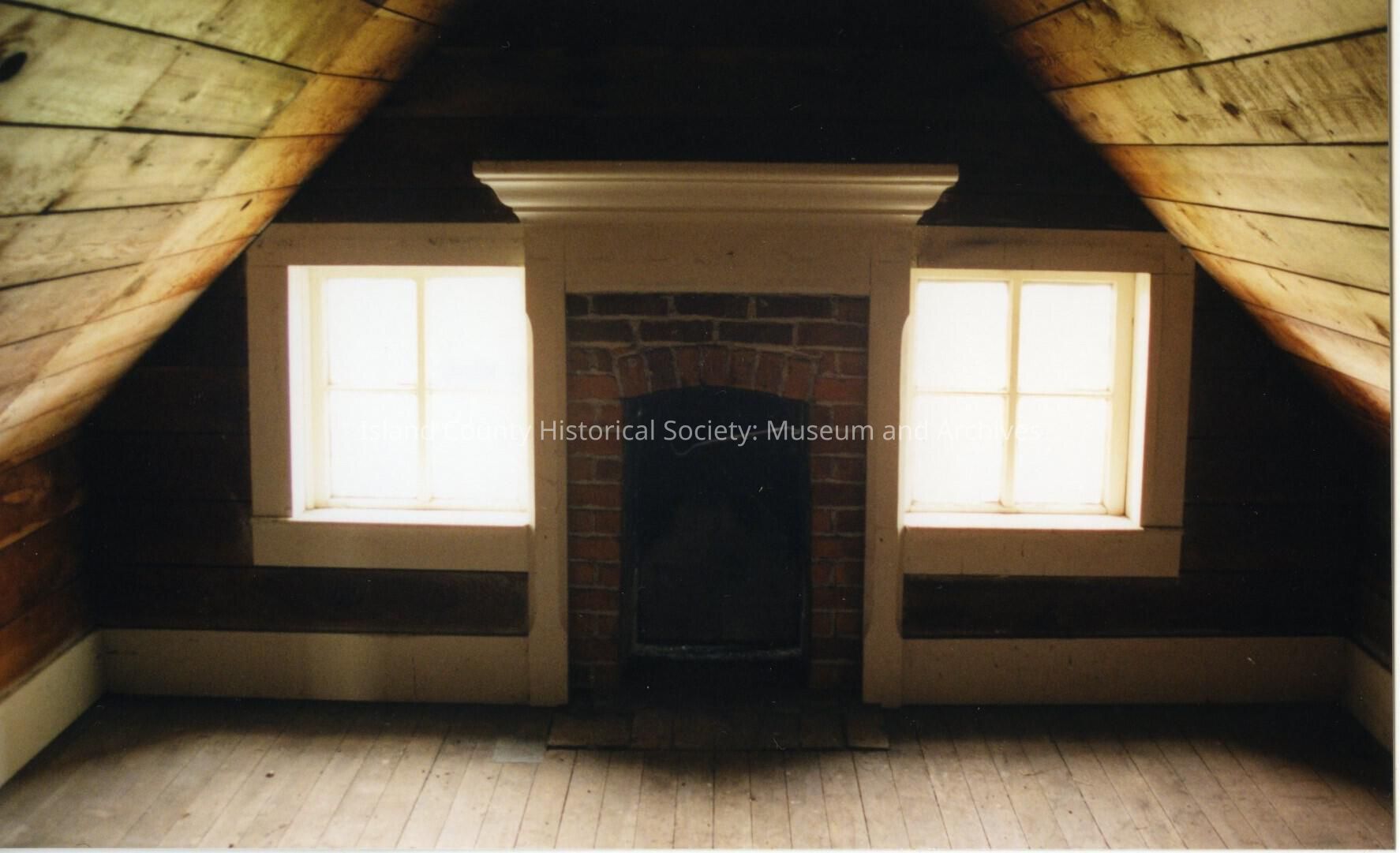 Jacob and Sarah Ebey House. Close up shot of interior scene showing small brick and white panelled fireplace with small squarish windows, one on either side. Sloping roof on either side making roof a bit triangular. Four panes to each window and windows are framed in white.