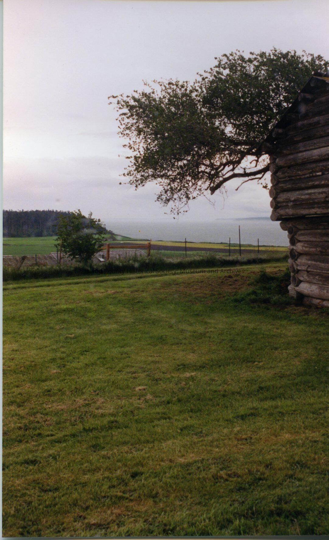 Jacob and Sarah Ebey House. Shot showing partial view of loghouse on right, but mostly of Ebey's Prairie looking away from the house. Either it was taken through a dirty window or the camera lens got water drops or debris of some kind on it- note the white smears where the tree is in the middleground towards the left.