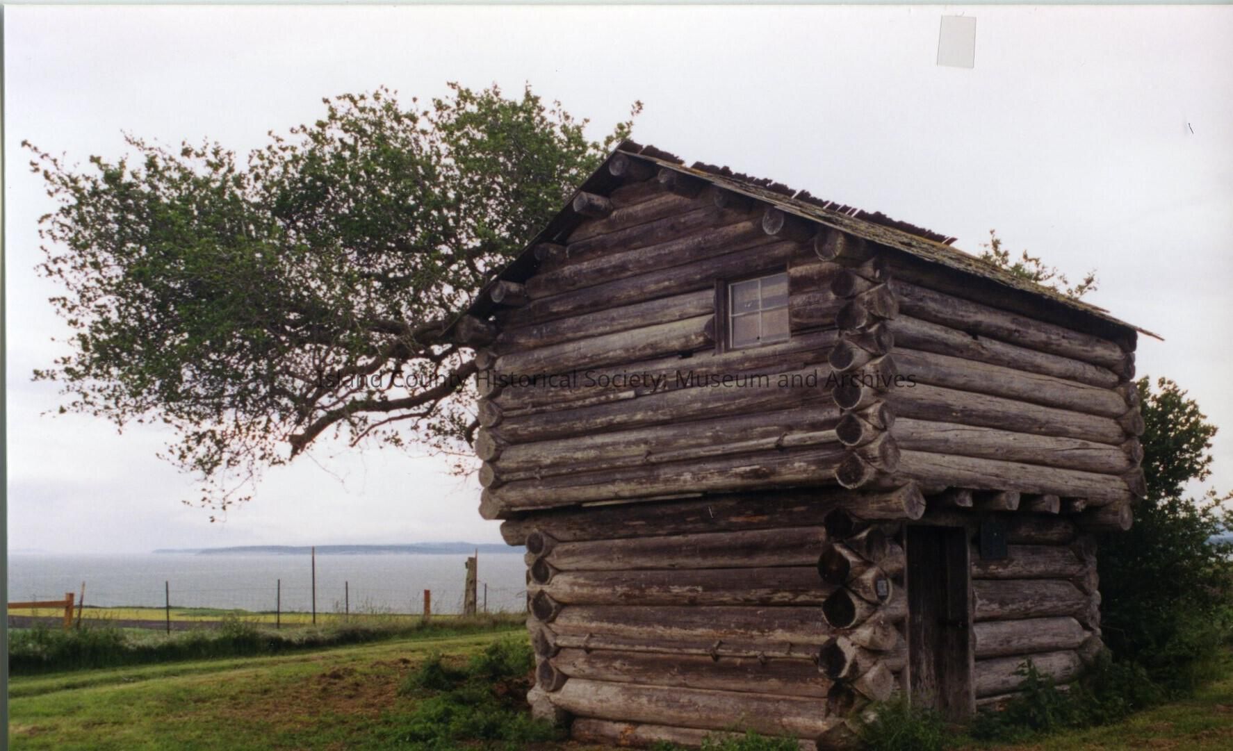 Jacob and Sarah Ebey House. Partial view of lob cabin across from the house on Ebey's Prairie. Doorway captured on right as well as window in upper level. Tree leaning out to the left behind the loghouse. Prairie in the background and water.