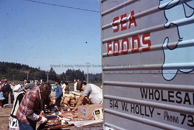 Caption on slide reads: Indigenous Peoples preparing salmon. Salmon barbecue. Date written on slide reads 8/21/66.