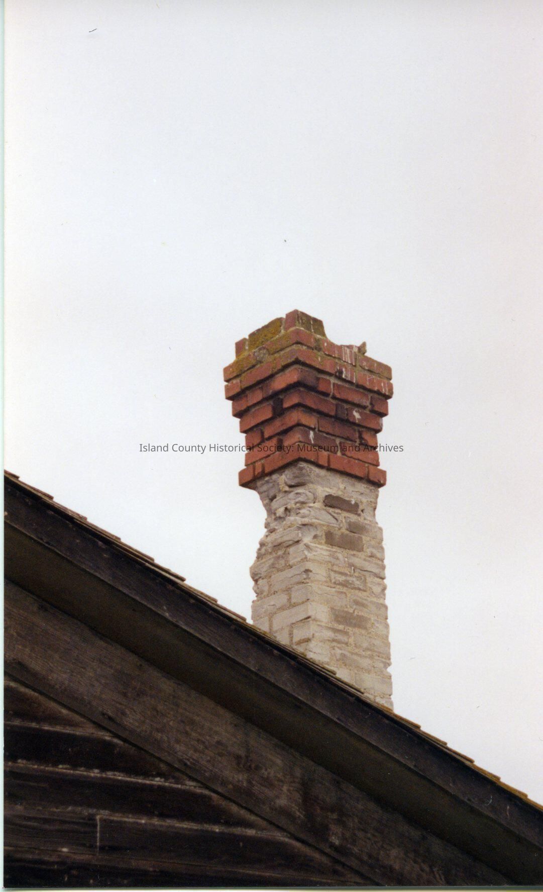 Jacob and Sarah Ebey House.Close-up exterior shot of one of the chimneys. Made of brick, red brick wider top section and "stem" part is white brick and very chipped and weathered. Guano drips down it and lichen has grown upon it.