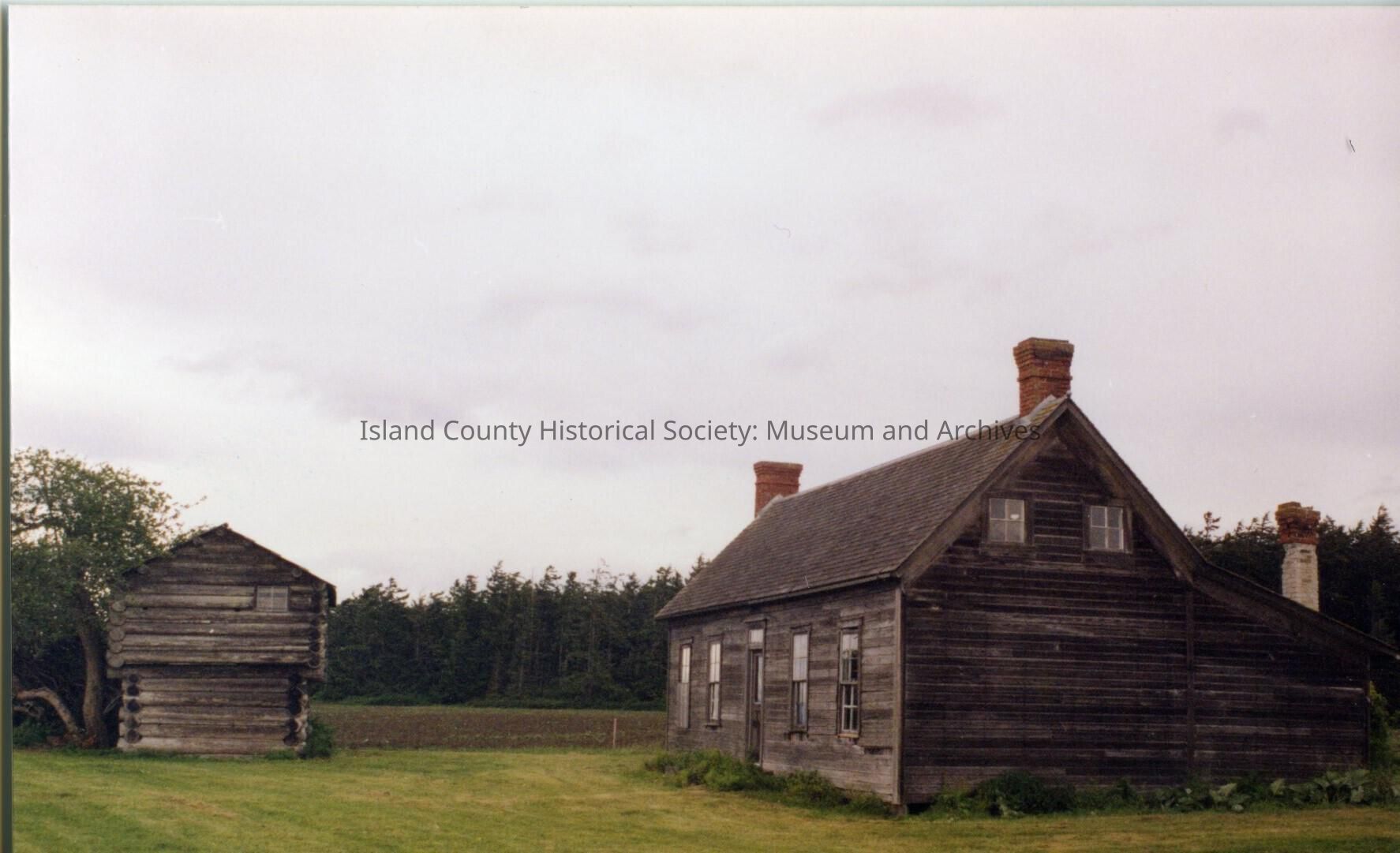 Jacob and Sarah Ebey House.Same scene as 2016.33.250, but this one is further in. Partial view of house and loghouse across from it. Front section mostly visible from the side. All three chimneus visible. View of shorter side on the right is visible which shows the upper leve of the house- the small window near the roof eaves.