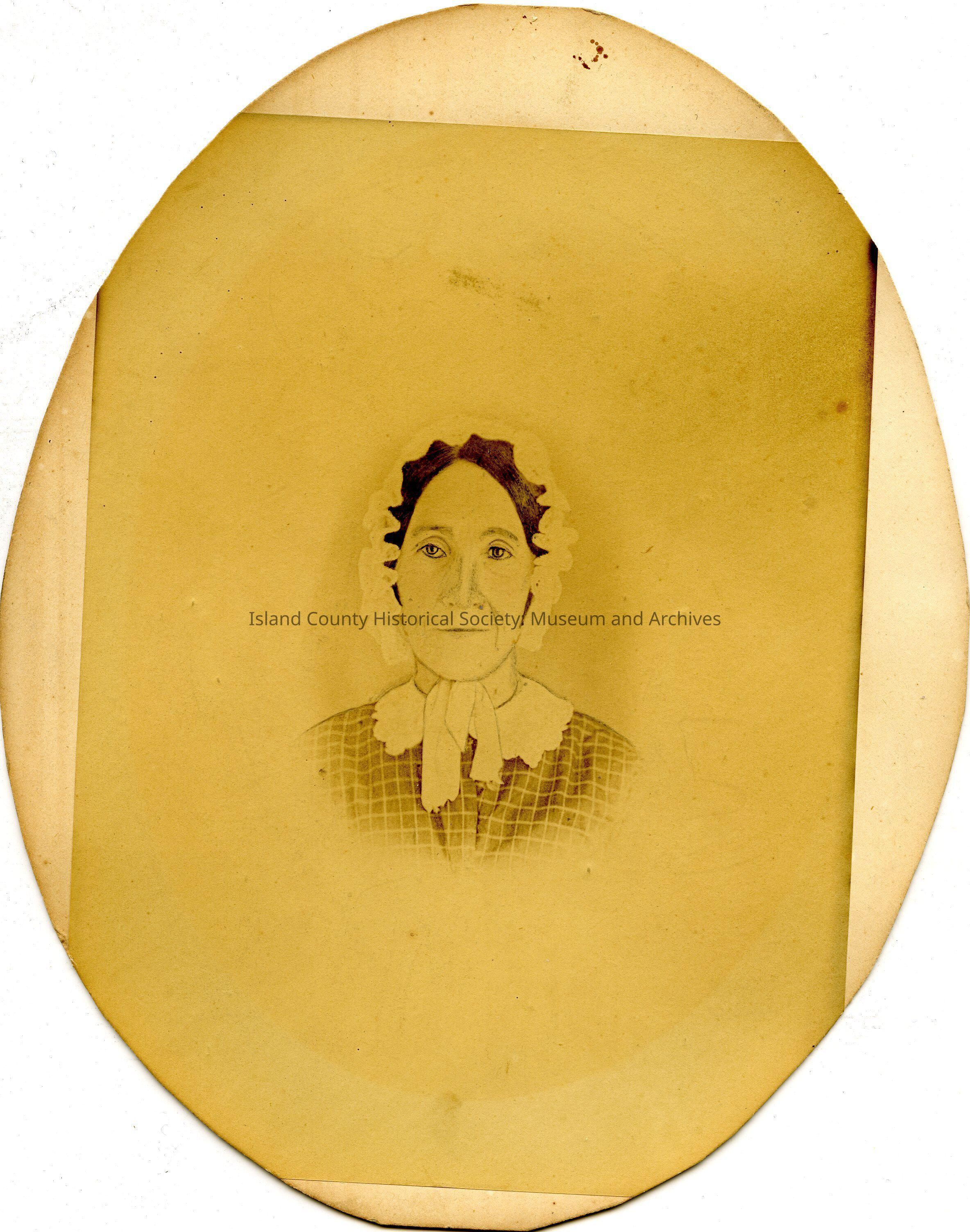 Oval pencil drawing of Martha Coe Kellogg. She is wearing a checked dress or top with a lace collar and a lacy bonnet tied under her chin. On the back: Martha Coe Kellogg. Died Oct 10, 1857. Mother of Dr. John Coe Kellogg.