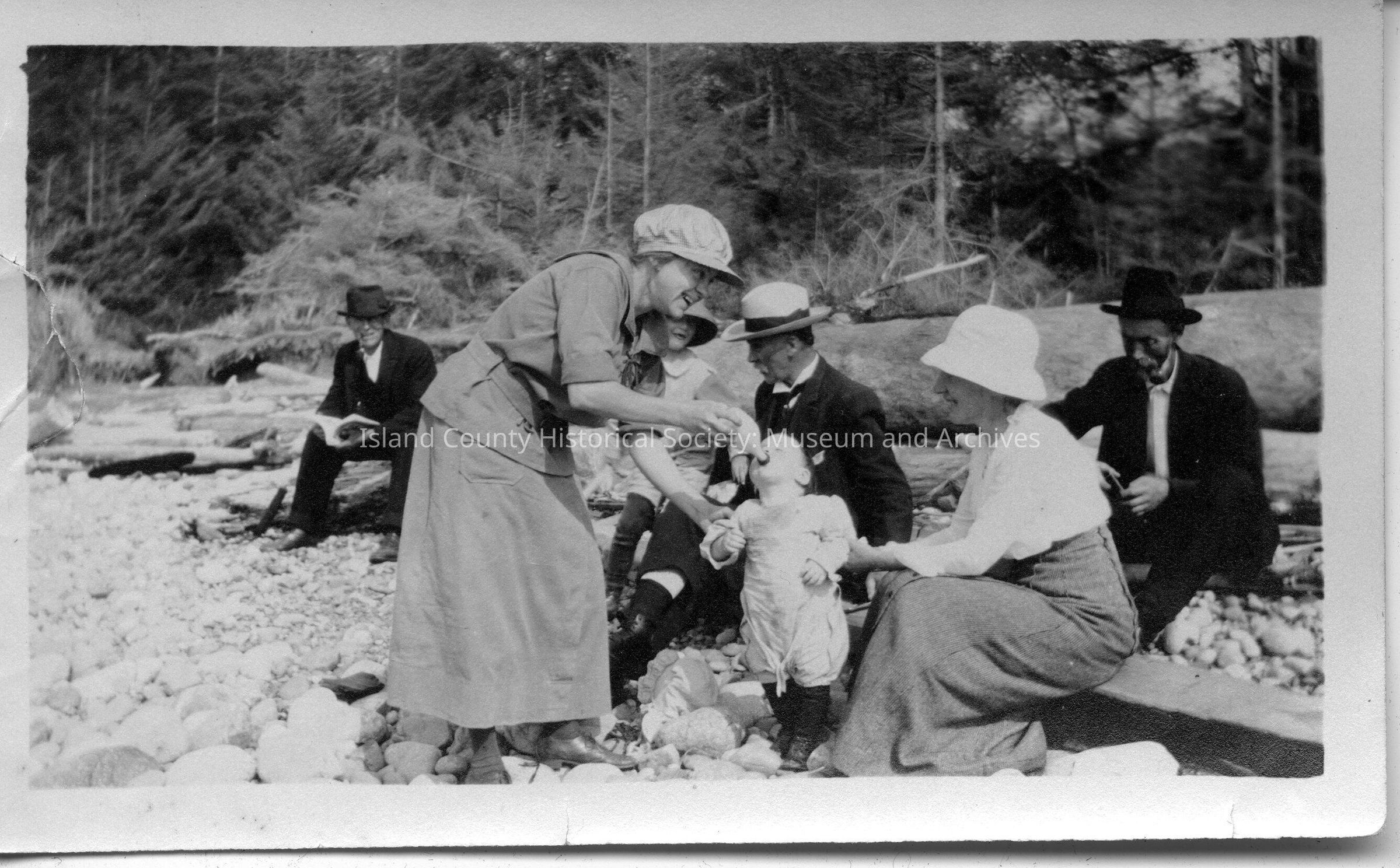 A black and white photo of a group of people outside, maybe at the beach. Handwritten on the back is "Margaret feeding child, Isaac N. - center, Henry C. - right rear."